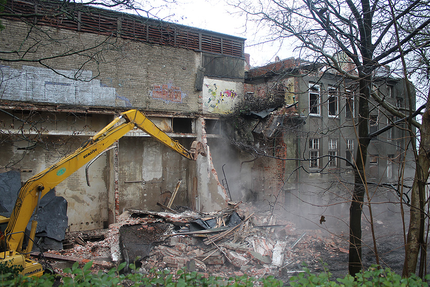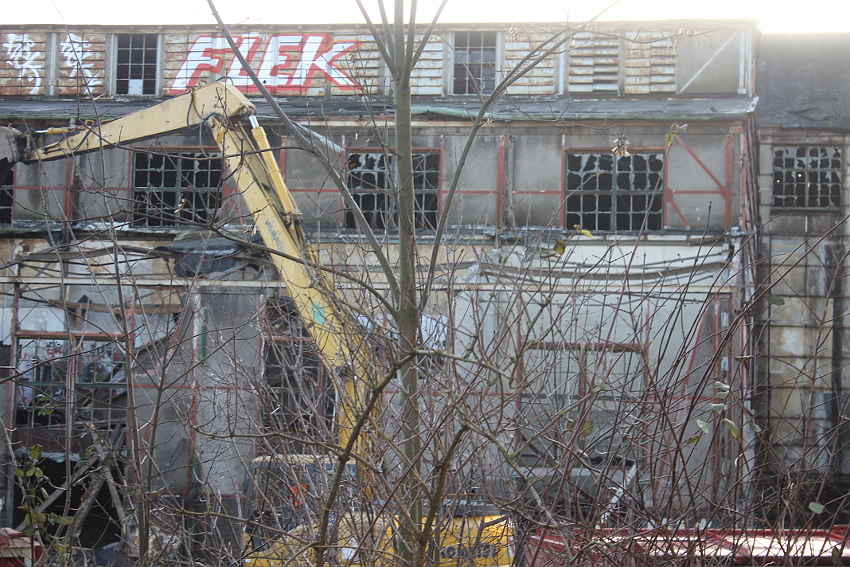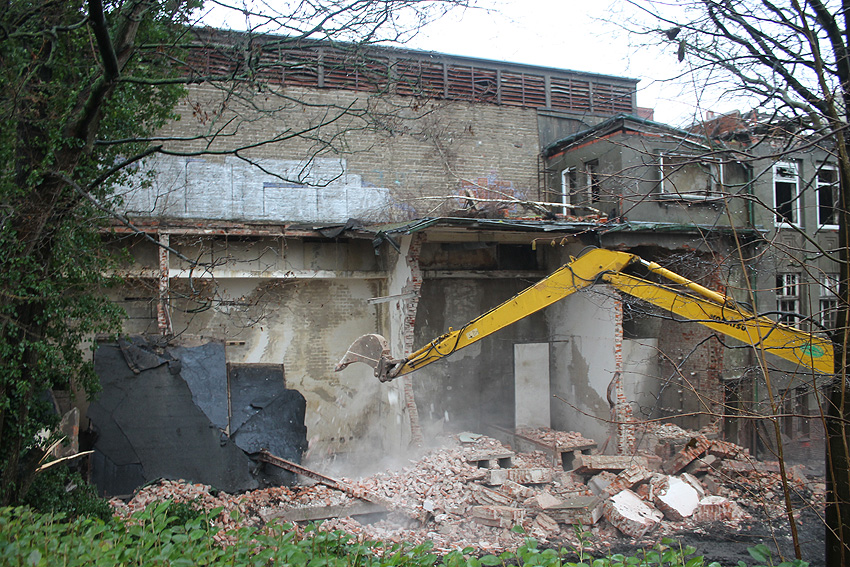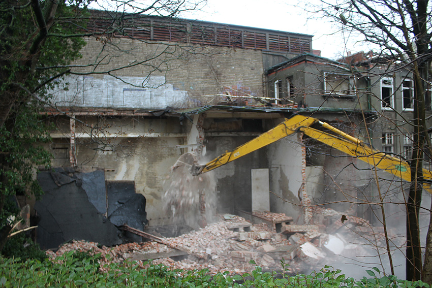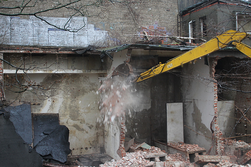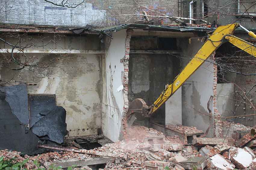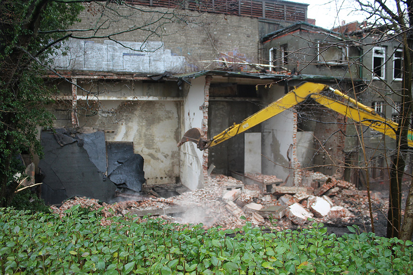 03.12.14: Südzentrale: ABRISS. Heute wurde - wie befürchtet - mit dem Abriss begonnen bzw. der seit Monaten schleichend laufende Prozess der Zerstörung wurde fortgesetzt. Der kleine Anbau nördöstlich an der Maschinenhalle wurde bis auf den Erdgeschosssockel vernichtet. Danach wurde das Unterfangen jedoch wieder gestoppt. Scheinbar sollen nächste Woche noch einmal Gespräche zwischen Verein und Eigentümern stattfinden. Ist das nun das Ende der Südzentrale? In der Tagespresse - Südzentrale: Abriss vorerst gestoppt