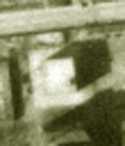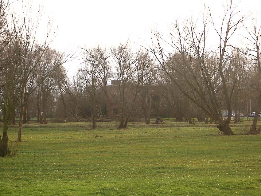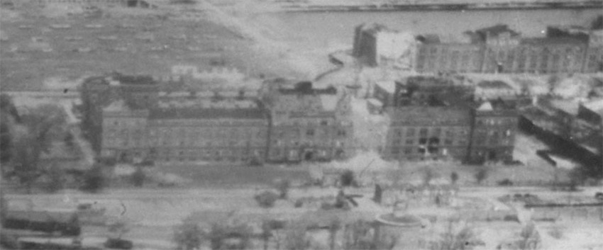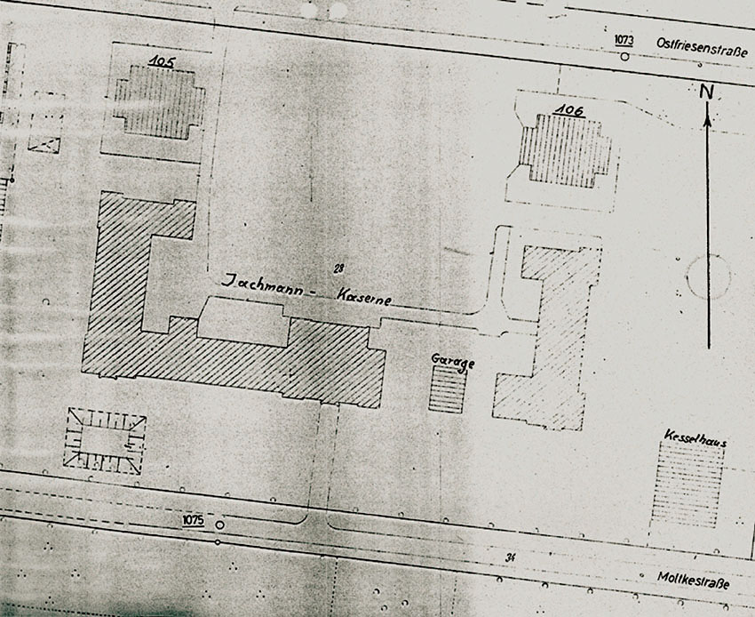 Mittig rechts im Bild hinter dem Kasernengebäude zu sehen der Truppenbunker. Wie auch der Westbunker wird er eine helle Aufschrift an der Westwand an gleicher Stelle besessen haben. Hier gut zu sehen das höchstwahrscheinliche Schriftfeld über dem West-Splitterschutzvorbau. Es wird aber nach dem Krieg schnell wieder verblasst sein. Die Frage ist, was dort stand. "Jachmann" / "Scharnhorst" / "Gneisenau"...?