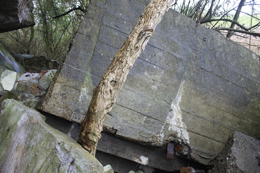 Unter dem zweiten Pfeil von links die Kuppel des gesprengten Turmes. Die Reste der (Rund)Türme 3 und 4 waren hier bereits scheinbar großteilig entfernt (größerer Bildausschnitt nach links hin liegt vor). Dies dürfte damit zusammenhängen, dass diese spärlicher bewehrt waren und die Trümmer somit leichter beseitigt werden konnten. Auch die Sprengung selbst dürfte diese Türme in kleinere Trümmer zerborsten haben, als die anderen Exemplare im Banter Lager.
