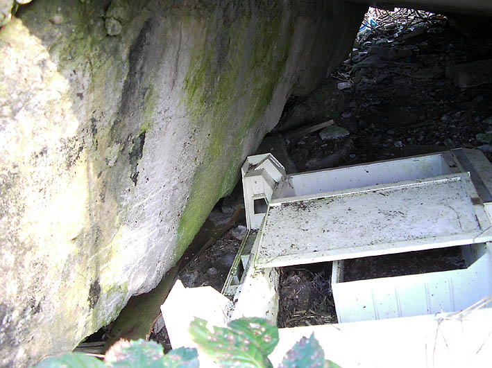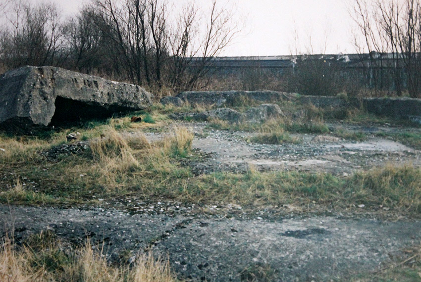 Das einzige große erhaltene Trümmerstück auf der Fundamentplatte / Zerschellerplatte muss aus dem Inneren des Turmes stammen, vielleicht Teil einer Decke / Trennwand? Es könnte auch sein, dass dies die innere Prellwand der Gasschleuse eines der Eingangsbereiche war. Die Wand wäre dann aus dieser Blickrichtung nach vorne auf den Boden gekippt. Das Trümmerstück entspricht in seiner Tiefe einer Geschosshöhe...