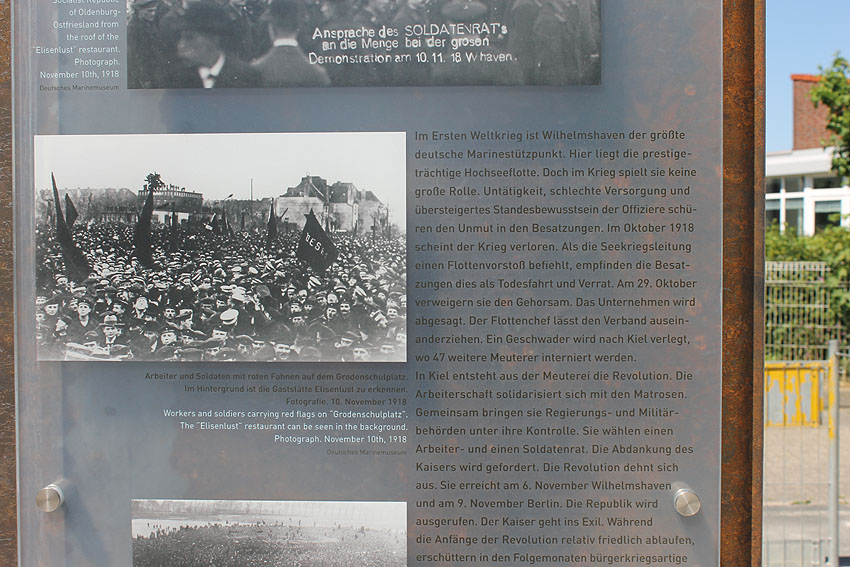 Kurios ist, dass hier das historische Elisenlustgebäude 2019 abgerissen wird, ein wichtiger Ort gerade auch im Hinblick auf den Matrosenaufstand. 2018 Aufstellung eines Denkmales für einen Ort, ein Gebäude, was ein Jahr später dann planiert wird. So etwas muss erhalten bleiben. Aber da reden wir gegen Betonköpfe...