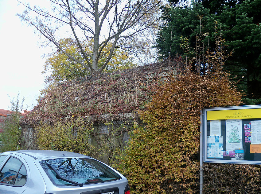 "Auf dem Gelände des ehemaligen Botanischen Gartens stehen noch zwei Bauwerke aus der Zeit vor dessen Gründung. Nämlich zwei betonierte Deckungsgräben der damaligen Grodenschule. Nördlich und südlich an der Geländebegrenzung. Die Grodenschule stand bekanntlich mittig versetzt nach Osten hin. Davor der ehemalige Schulgarten, welcher später einmal der Botanische Garten wurde. Die Schule selbst ist 1944 großteilig zerbombt worden. Die Schutzbauten retteten Menschenleben, hier Kinder und Lehrkräfte. Nach der Zerstörung des Schulgebäudes sind aber auch vermehrt Anwohner der umliegenden Wohnbereiche in die Anlagen geströmt, als die Sirenen heulten. Sie bilden als Sonderbauten des damaligen Luftschutzes in ihrer eigenwilligen Bauform einen festen Bestandteil der bewegten Stadtgeschichte.