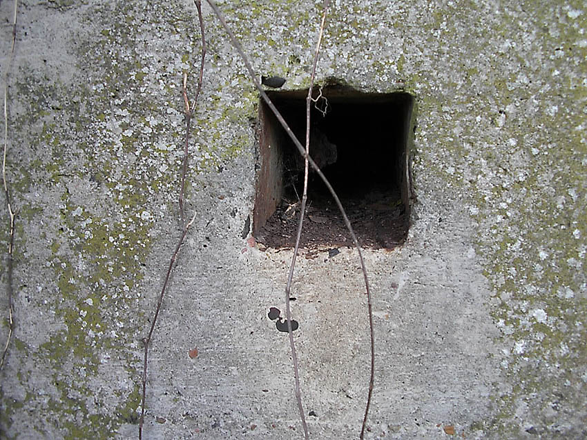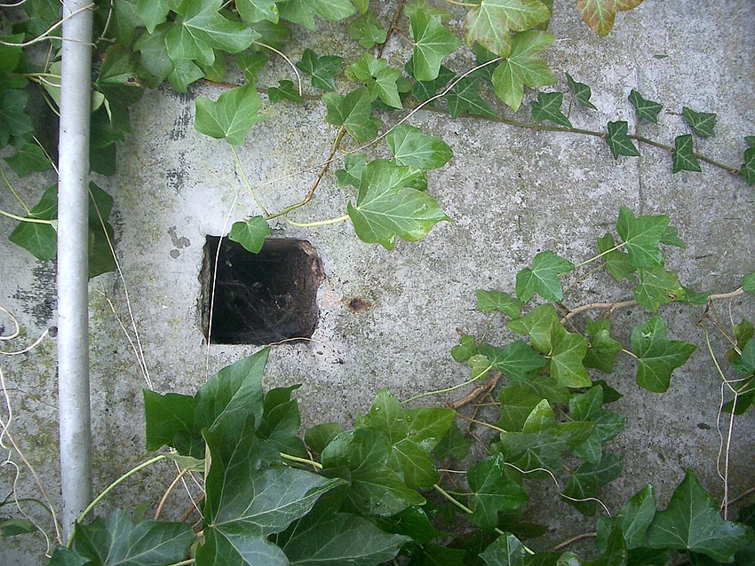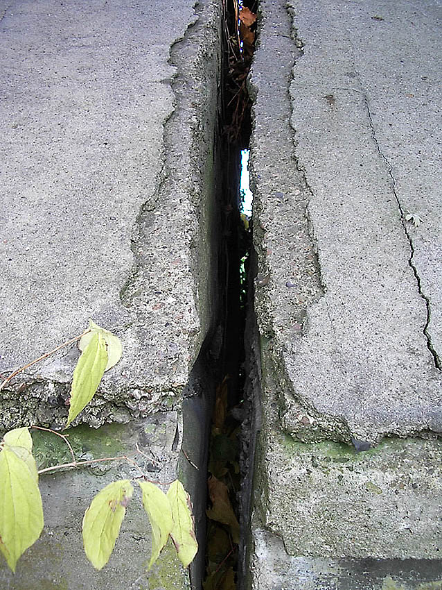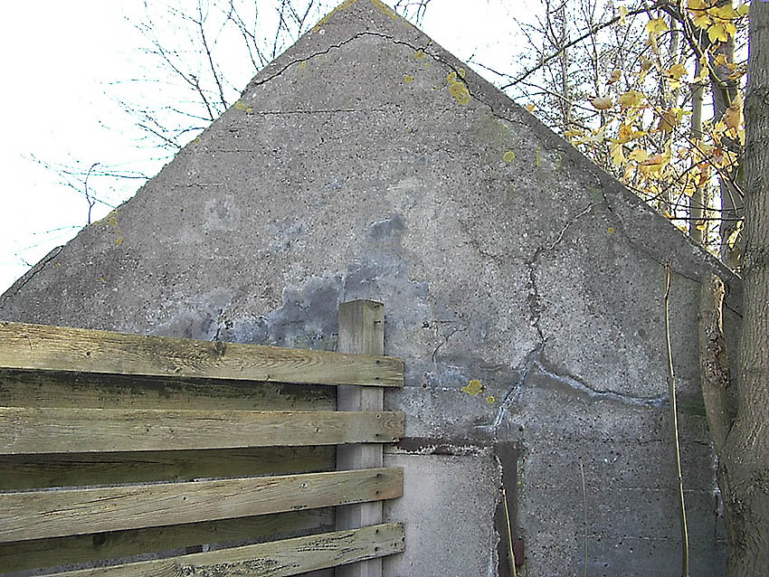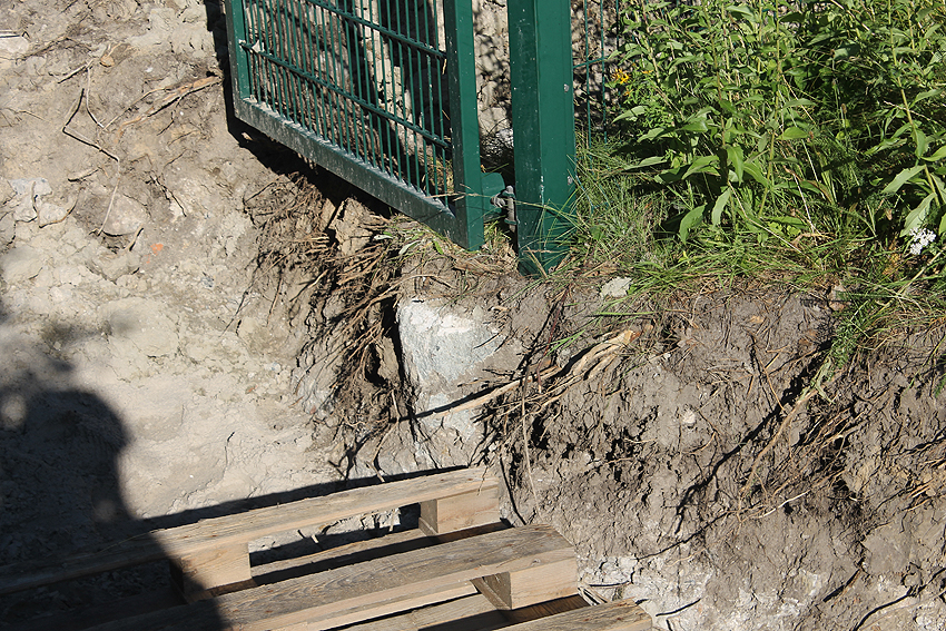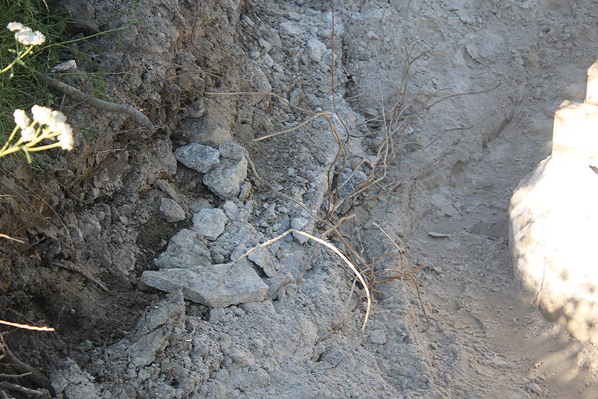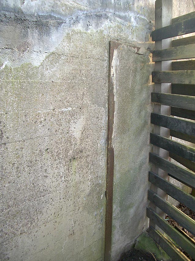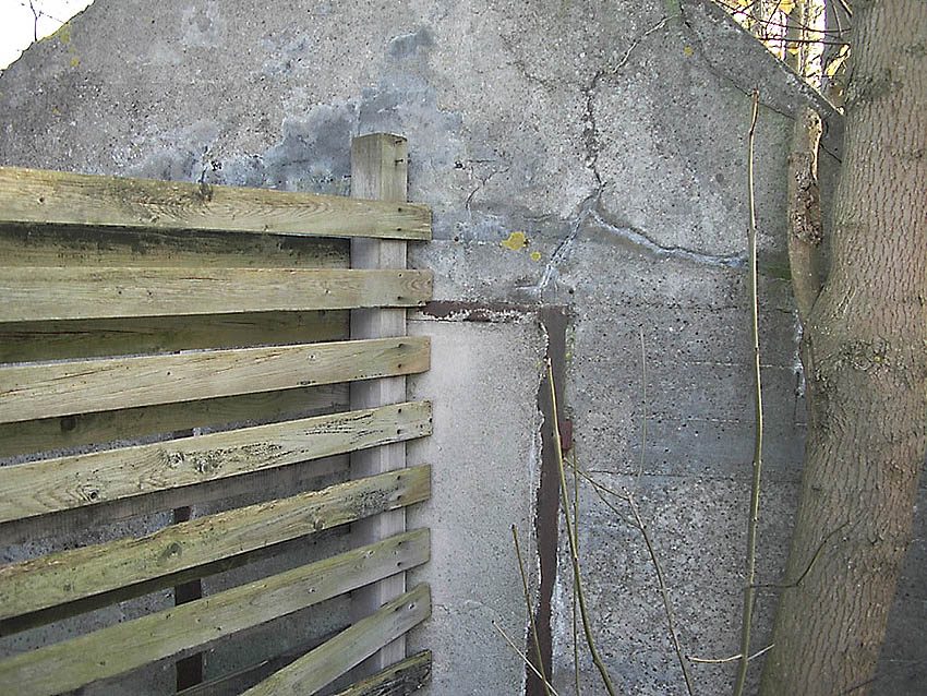 Dies ist eine der Baufugen des Grabens, welche ein Arbeiten des Betons bei dieser Länge ermöglichen sollten. Der Bereich der ursprünglichen beiden südlichen Fünftel löste sich mit der Zeit vom anderen mittleren Teil und sackte mehr und mehr ab. Inzwischen hat sich ein handgroßer Spalt gebildet...