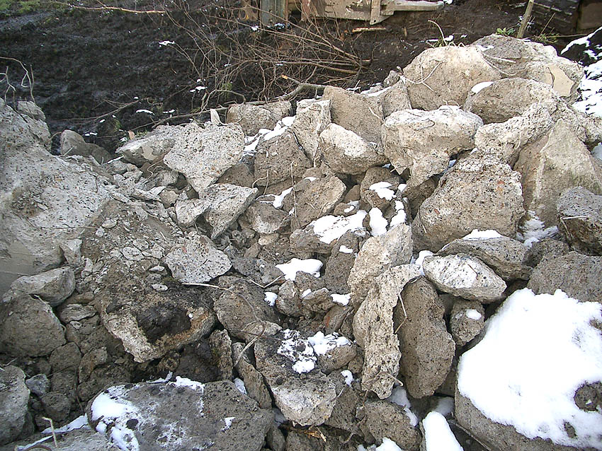 Durch den Bagger wurde hier am 1. März 2006 ansatzweise versucht, Teile vom Dach nördlich der Bruchkante abzuschaben...