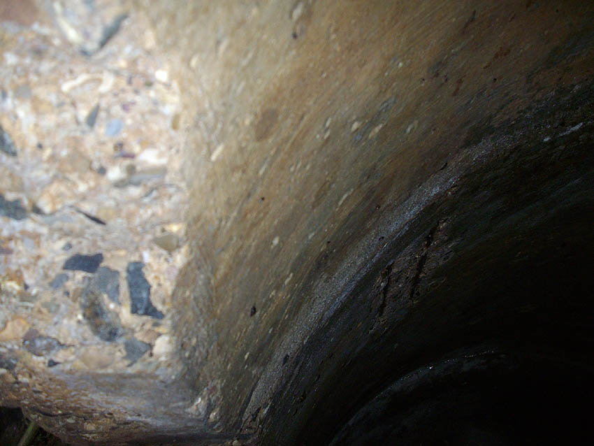 Der Boden der Zelle, Klinker überall. Die Zelle wurde mit dem geklinkerten Straßenboden der Zuwegung zur Flak Tirpitzhafen, auf der sie stand, vergossen.