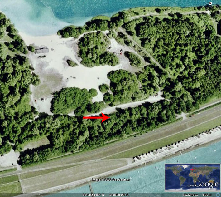 Beispiel der Bunkersuche im Februar 2009: Die missglückte Suche vor einigen Wochen ungefähr 200 Meter nördlich des Zellenstandortes direkt am Ufer des Banter Sees, ausgestattet mit "modernsten Wasserschutzhosen". Alle nur erdenklichen Möglichkeiten des Zellenverbleibs mussten recherchiert werden (Resultat dieser Aktion: Negativ, Hose nass, grippaler Infekt drei Tage später):