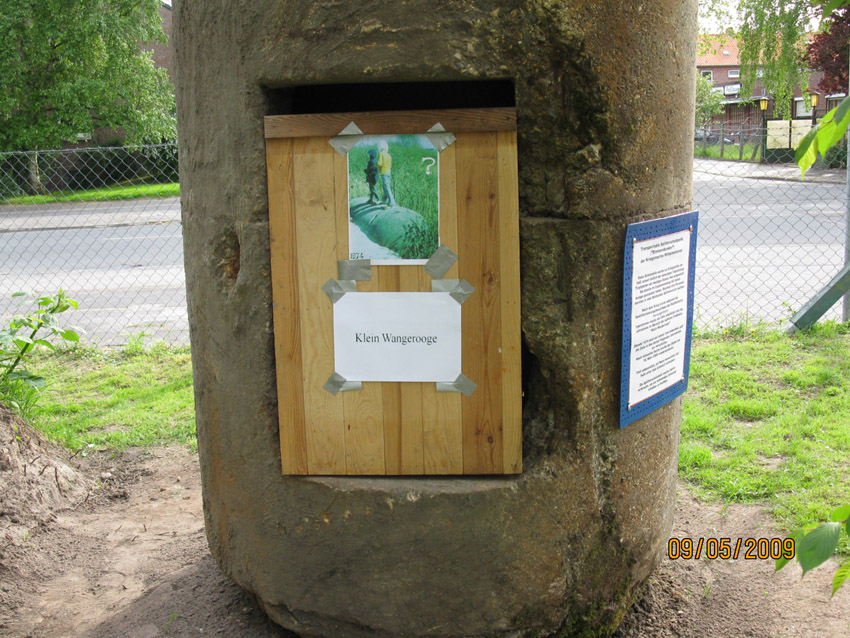 Es ist geschafft. Am 28.04.09 zwischen 8 und 13 Uhr wurde die Splitterschutzzelle von Klein Wangerooge zum Minsener Oog 1A umgebettet. Die immens lange Zeit kam deshalb zustande, da ein großer Betonbrocken wider Erwarten das Heben der Zelle verhinderte. Also musste sie dann aus ihrem Liegeort hinaus gezogen werden. Auch wog die Zelle unerwartet viel: 7 Tonnen! Das Wetter war leider regnerisch, aber alles in allem hat die Aktion dann im weiteren Verlauf relativ gut geklappt. Die Zelle wurde heute bereits ein wenig gesäubert und das Hinweisschild angebracht. Auch wurde bereits aufgrund einer Furche im Beton nachgewiesen, dass es sich definitiv um die Zelle handelt, welche Herr Klose 1974 abgelichtet hat.