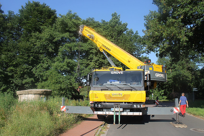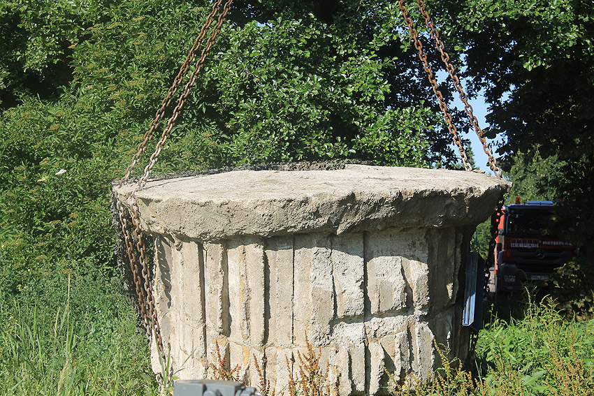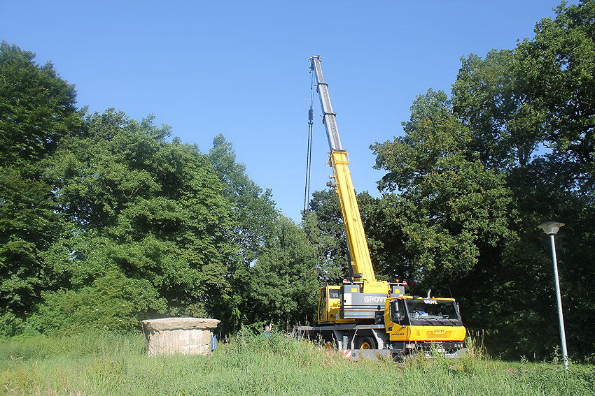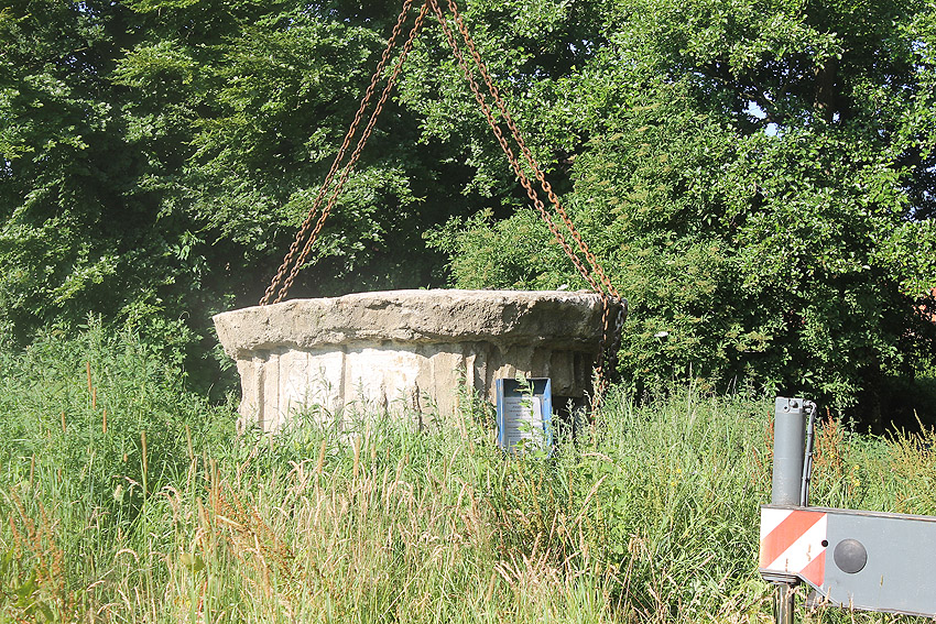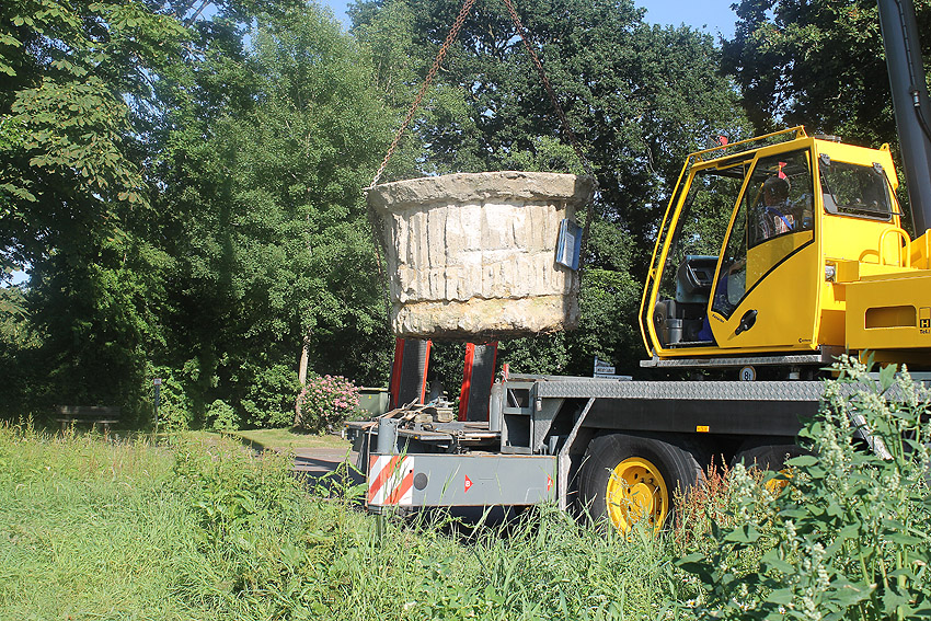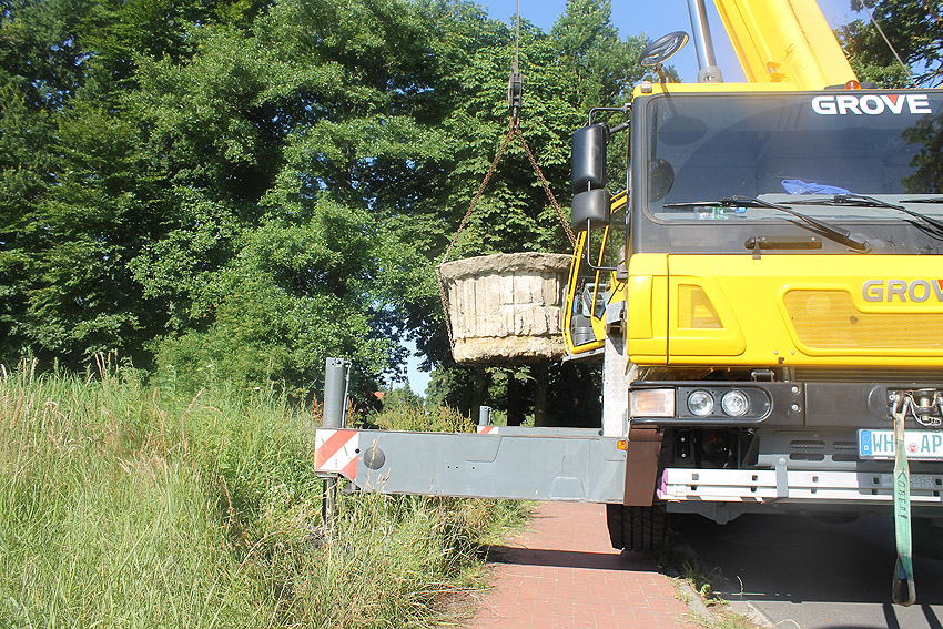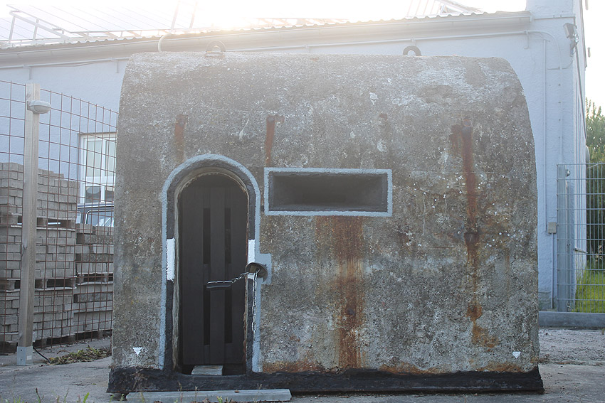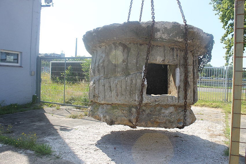 18. Juli 2013: Nach einem halben Jahr Vorbereitung und Koordinierung sagen wir heute: "Ende gut, alles gut!" Der Tobrukstand als interessantes, martialisches Zeugnis des geplanten "Friesenwalls", in einem Friedeburger Erdloch für einen MG-Schützen Ende 1944 gegossen, wurde heute intakt nach Wilhelmshaven verbracht. Er steht nun als erster von fünf Kleinbunkern auf dem IEHF-Gelände am Kanalweg. Wir danken der Firma Hepag für den reibungslosen Transport, der Interessengemeinschaft zur Erhaltung historischer Fahrzeuge für den Stellplatz, der Firma JK-Fahrzeugtechnik für die Holzspende, dem WZ-Fotografen für die Ausdauer (wir hatten uns um ca. 30 min. mit der Ankunft verschätzt) und Herrn Wiard Remmers, der alles damals und bis jetzt durch seine Hilfe erst ins Rollen brachte.