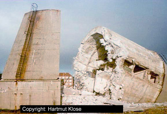 Eine Aufnahme aus frühen Kriegstagen, noch ohne später angebrachte Wandverstärkungen und ohne abgeschrägte Splitterschutzeingangsvorbauten wie auf den obig abgebildeten Aufnahmen. Interessanterweise ist der Turm zusammen mit dem bauartgleichen Bunker auf der ehemaligen Kriegsmarinewerft / Ostkaje (dieser ohne Verstärkungen) von der Grundform her ebenso sechzehneckig wie die bekannte 10er-16-Eck-LS-Turmserie Wilhelmshavens. Interessant ist der Ausstieg an der Bunkerwand in Ebene 5. Von hier aus konnte der auf den Turm gesetzte Beobachtungsstand mit integrierter Metallsplitterschutzzelle (andere Quellen bezeichnen ihn auch als Scheinwerferstand) über eine Steigleiter betreten werden. Im Zuge der späteren Verstärkung des Turmes wurde die Öffnung verschlossen und die Steigleiter hatte ihren Beginn am verbreiterten Turmsockel. Der hier abgebildete Turm wurde nach dem Krieg ansatzweise entfestigt (auf einigen der oberen Bilder zu erkennen) und 1975 abgebrochen.