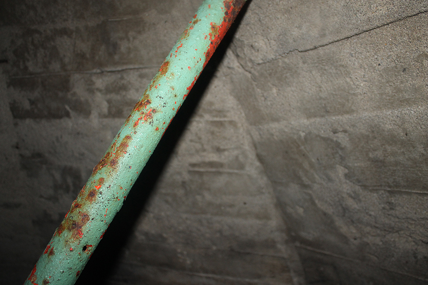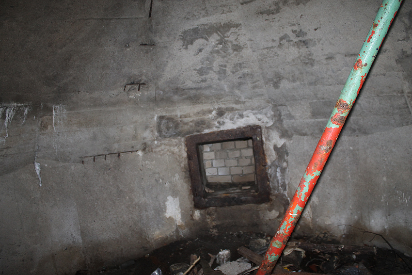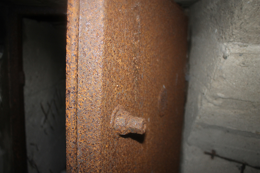Anfang 2016 war der Bunker zeitweise zugänglich. Interessant ist die saubere Schalung im Inneren, besonders die zehneckige innere Kuppelschalung, das Luftrohr genau mittig in der Kuppel, die beiden LS-Türen und der Notausstieg.