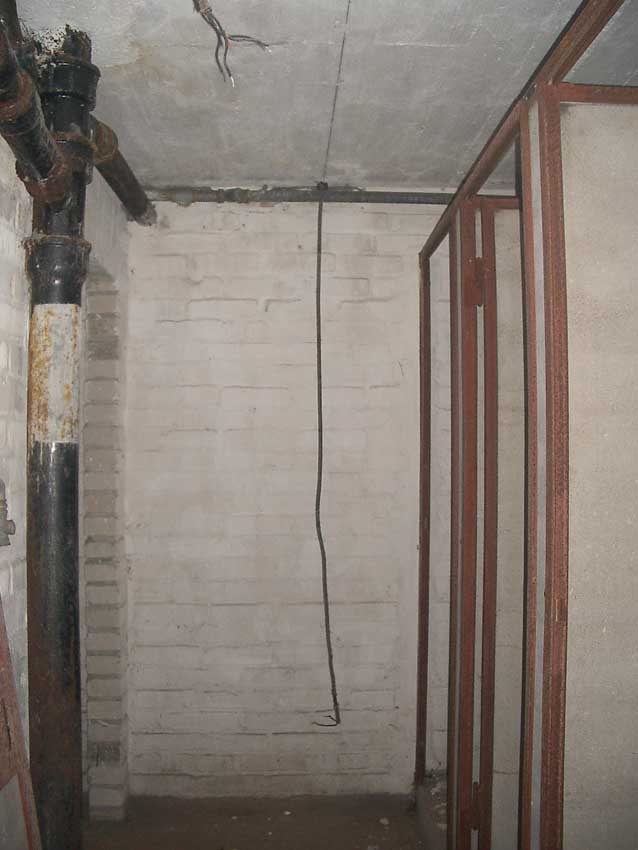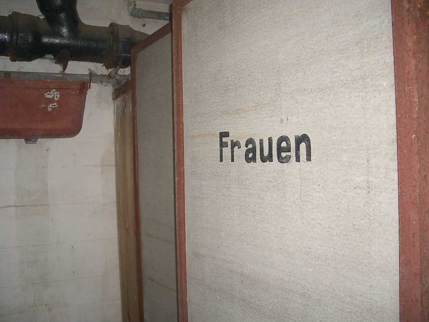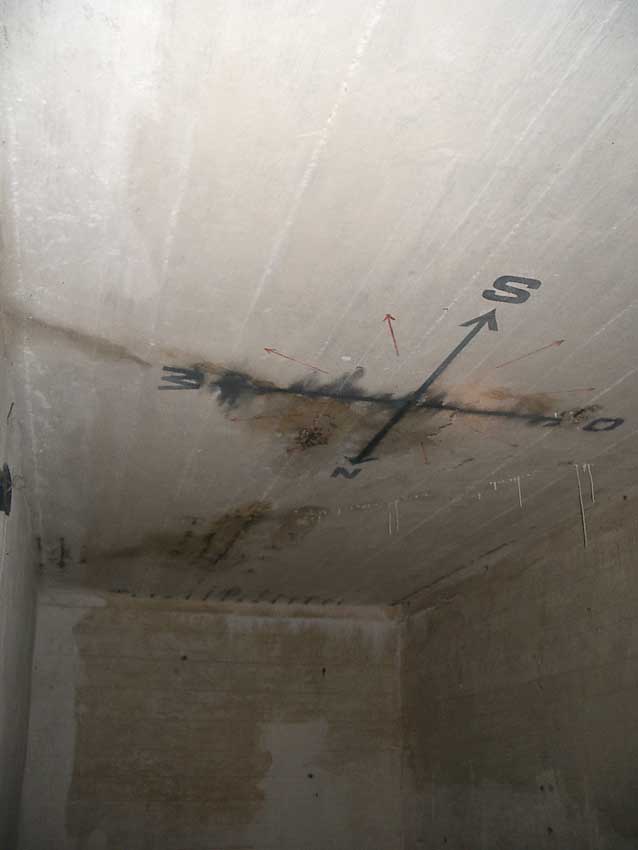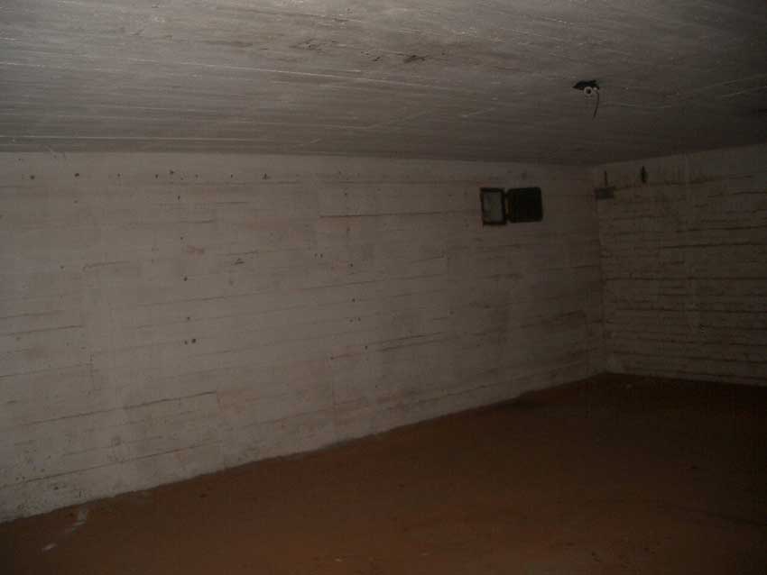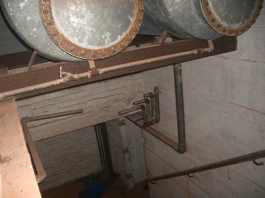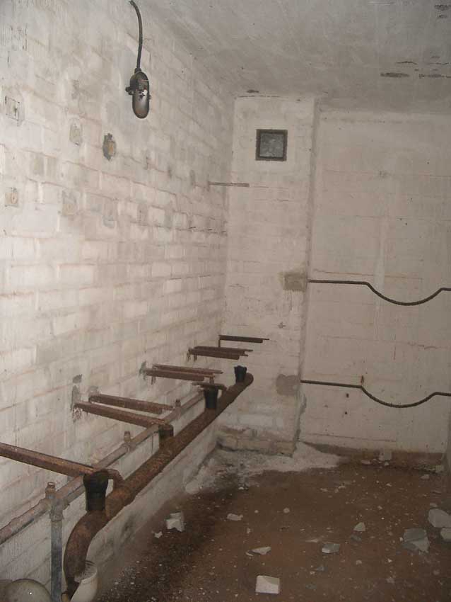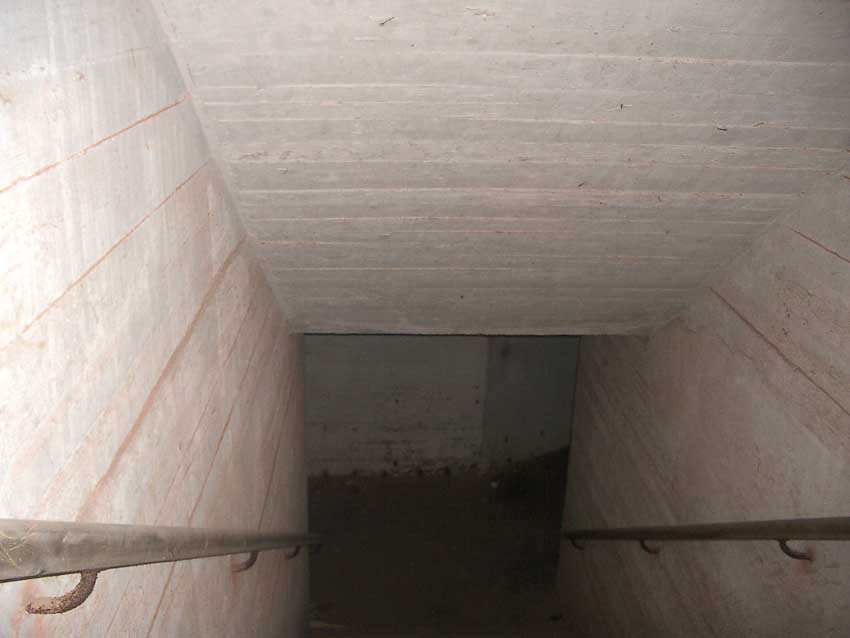 Anmerkung: Bei diesem Tank handelt es sich um ein offenes Ausdehnungsgefäß. Es gehörte zur Heizungsanlage und stellte den höchsten Punkt dar. Es wurde Wasser aufgefüllt, bis der Behälter überlief. Das sich beim Aufheizen ausdehnende Wasser tropfte aus dem Überlauf. Im Betrieb stellte sich ein bestimmter Pegel ein. Von Zeit zu Zeit musste verdampftes Wasser wieder ergänzt werden. Man erkennt sehr gut die drei Anschlüsse: Vorlauf, Rücklauf und Sicherheitsüberlauf. Alle Truppenmannschaftsbunker besaßen in der obersten Ebene diesen Tank.