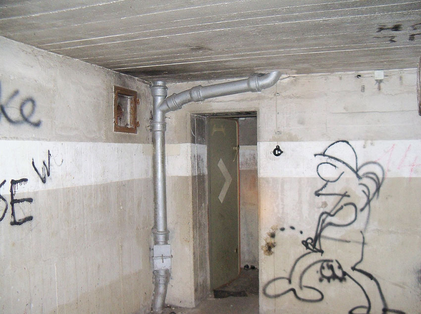 In den 1980er Jahren bis in die 1990er Jahre probten in allen acht Haupträumen des für den Zivilschutz in den 1960er Jahren bedingt hergerichteten Bunkers Musikgruppen. Deren Überbleibsel sind noch heute vorhanden. Auffällig an der Innenseite der Abschlussdecke ist die Stahllamellenpanzerung, wie sie sonst auch bei Regelbauten des Atlantikwalles oft vorkommt. Das EG besitzt vier Aufenthaltsräume und vier kleine Aborte im Kern des Bunkers. Zwei gegenüberliegende Treppenhäuser sind vorhanden. Im Obergeschoss befinden sich wiederum zwei große Aufenthaltsräume (ehemals waren hier vier Räume, die Trennwände wurden später entfernt) mit zwei kleineren Verbindungsräumen beziehungsweise Gängen, in denen die insgesamt vier Wasserboiler für Frischwasser und Heizung installiert sind. Der Bunker wird Ende des Jahres an die BIMA zurückgegeben.