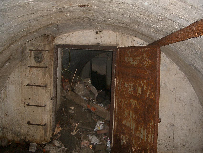 Blick zum östlichen runden Bunkerkörper, links der Aufenthaltsraum, rechts die Gasschleuse: