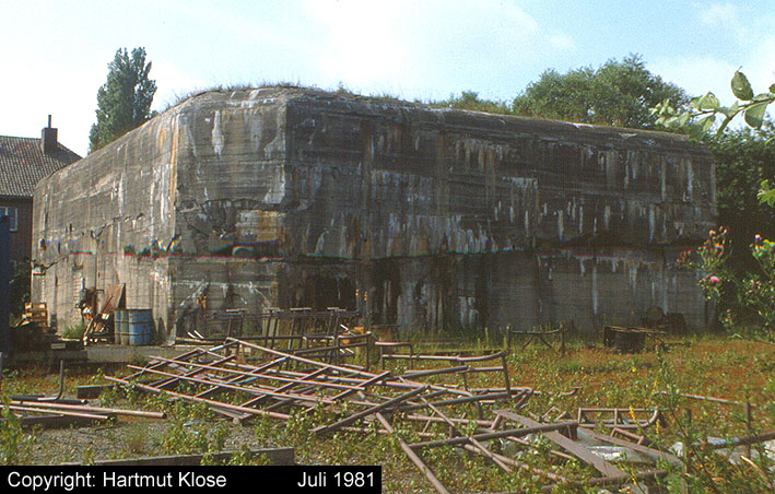 Aufnahmen des Truppenmannschaftsbunkers 750 2 an der Emsstraße. Der Bunker ist vom September 2014 bis Februar 2015 abgerissen worden. Aufnahmen aus den 1970er Jahren, 1972 und 1985.