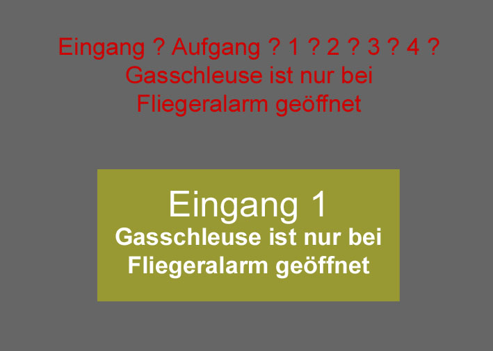 Dies könnte (nach Recherche der auf dem Foto erkennbaren Buchstabenreste) der Originaltext der an den vier Eingängen befindlichen, heute vollkommen verwaschenen Hinweisfelder sein...