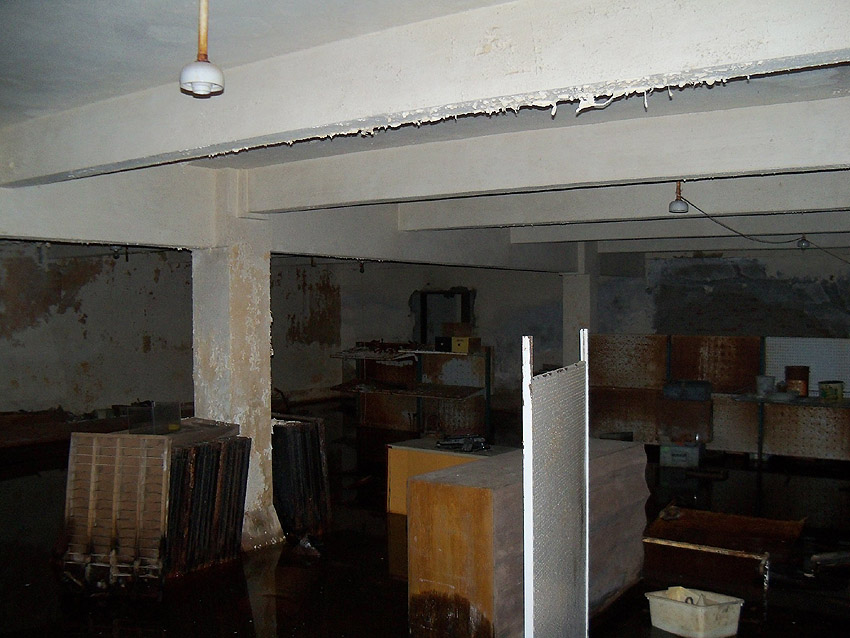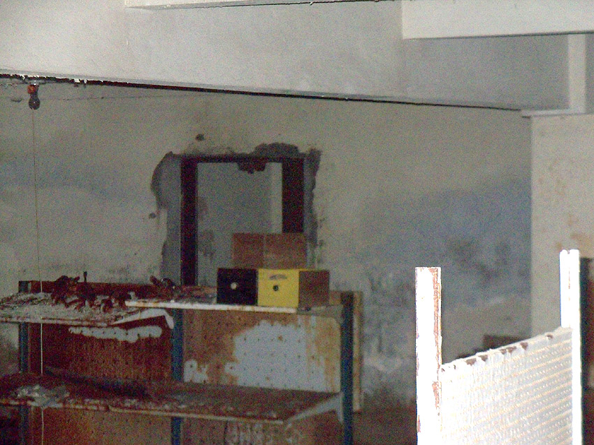 Beachtlich sind die beiden mit Beton umkleideten / verstärkten Stahlträgersäulen. Diese Maßnahme geschah, um dem Raum weitere Stabilität zu verleihen. Hinten links befindet sich der zweite, rückwärtige Eingang in den Keller. Dies wird der ehemalige Notausgang gewesen sein. Er führt fast direkt in das Erdgeschoss des Wohntraktes / Bürotraktes. Dort sind allerdings keinerlei LS-Spuren (mehr) erkennbar...