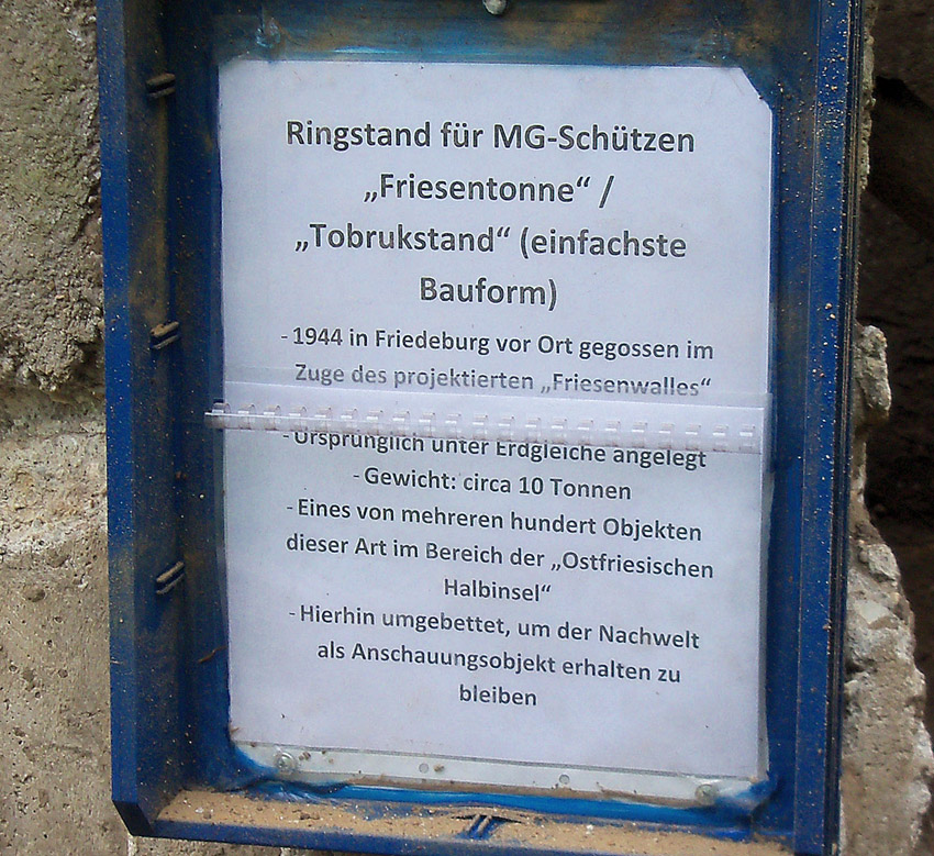 Es handelt sich hierbei um eine "Friesentonne". Der Begiff wurde im Bereich der Deutschen Bucht nachweisbar für Ringstände einfachster Bauart benutzt und ist auch in Schriftdokumenten wiedergegeben. Als "Friesentonnen" wurden sowohl einteilige "Tobrukstände" (benannt nach der Festung Tobruk Nordafrika / Afrikakorps Rommel) einfachster Form bezeichnet, wie auch die aus mehreren Teilen bestehenden "Kochbunker / Koch-Bunker / Kochstände / Koch-Stände" (nach Gauleiter Koch Ostpreußen).