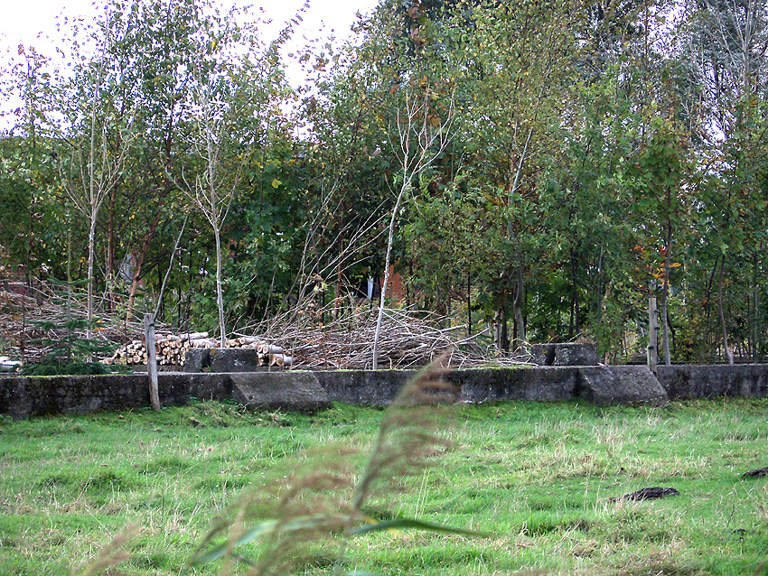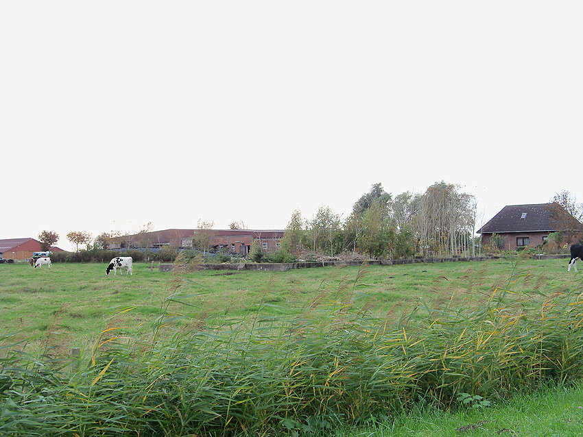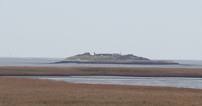 Folgende Bilder: Das ersichtliche Betonfundament und das Gebäude links im Hintergrund, gelegen direkt hinter dem Deich nahe der Zuwegung zu Langlütjen I, sind Relikte aus dem WK 2. Hier befanden sich Unterkünfte für die Mannschaften von Langlütjen I. Auf dem Ring-Betonfundament stand eine Wehrmachtsbaracke.