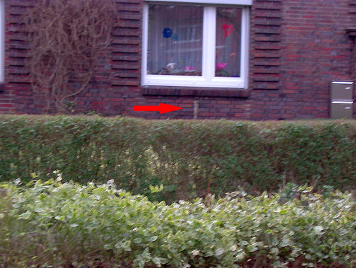 Es gibt auch Täuschungen. - Kein LS-Pfeil ist beispielsweise diese "Bemalung" am Mühlenweg 136 in Wilhelmshaven (unlogisch auch, da der "Pfeil" auf kein Kellerfenster zeigen würde...). Das Gebäude wurde erst nach 1945 errichtet...