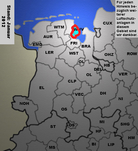 Kurzübersicht bombensicherer Luftschutzanlagen Kurzübersicht aller bisher nachgewiesenermaßen bombensicheren Luftschutzanlagen in Wilhelmshaven sowie der Vororte: Sengwarden, Fedderwarden, Langewerth, Mariensiel, Roffhausen, Middelsfähr, Cäciliengroden und Sande.