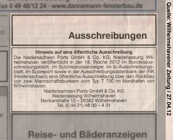 Aktualisierungen Bunker in Wilhelmshaven und Umkreis 2012