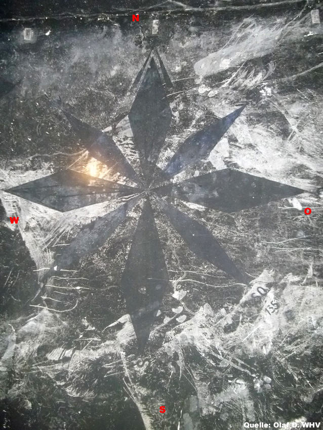 T 750 2 Hannoversche Straße: Auch in diesem Bunker ist wie im TROTZ, BANTER RUINE und U-BUNKER eine Windrose im Inneren, hier jedoch an eine Wand statt an eine Decke, gemalt worden. Vielen Dank an Olaf D. für die Infos und das Bild! Hier