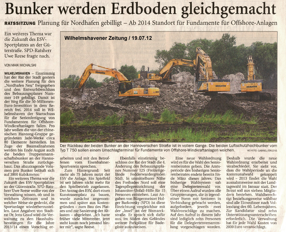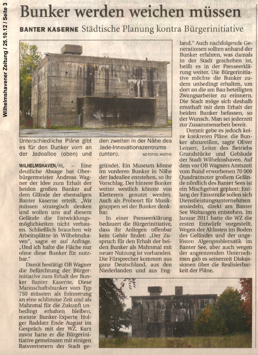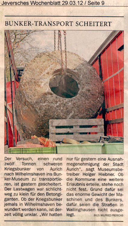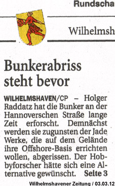 Heute erschien in der Wilhelmshavener Zeitung ein Artikel zu den Bunkern, der den Bürgern noch einmal verdeutlichen soll, was das für Bauwerke sind: Hier Der Artikel bei WZonline.de: Hier