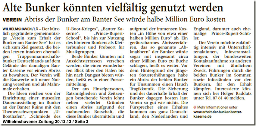 Verein zum Erhalt der Bunker am Banter See in Wilhelmshaven e.V.: SCHONFRIST: Eine glückliche Nachricht zum Weihnachtsfest. Die beiden ehemaligen Truppenbunker der Banter Kaserne in Wilhelmshaven haben nach vertrauenswürdiger Quelle von städtischer Seite eine Schonfrist über das Jahr 2013 hinweg bekommen! Das bedeutet: Wenn Abriss, dann erst 2014 oder später. Das bedeutet weiterhin: