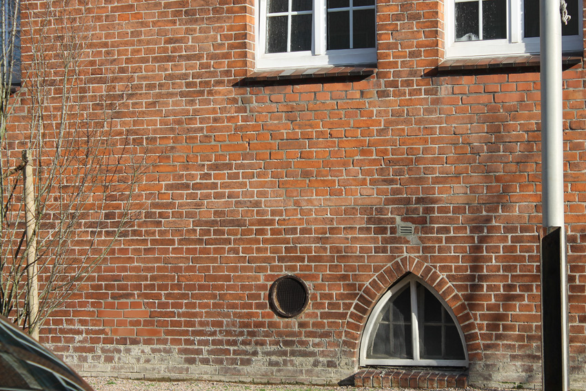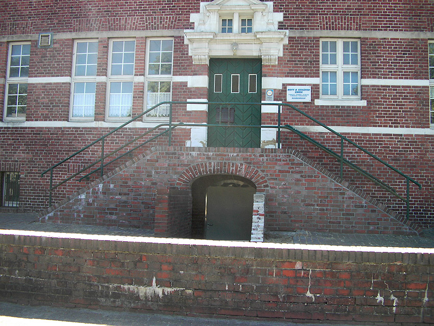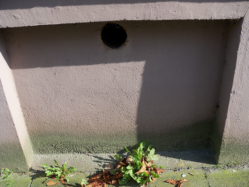 Bontekai 55: Der LS-Keller ist unter dem Gebäude noch immer vorhanden. An der Nordseite des Gebäudes ist noch immer ein LS-Kellereinstieg / Notausstieg existent. Klar erkennbar sind auch die Beton- und Mauerwerksverstärkungen der Kellerdecke. Der Sockelbereich wurde zudem großteilig verputzt. Danke an Klaus für den Hinweis! Hier