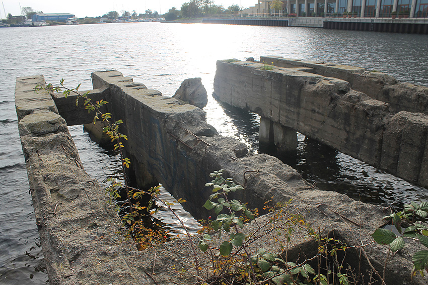 Was sind dies für Objekte, insbesondere der hier erkennbare betonverstärkte Schacht am Bontekai schräg gegenüber des Küstenmuseums? Handelt es sich hierbei um eine der im Hafenbereich im Krieg errichteten gesicherten Löschwasser-Schöpfstellen? Hier
