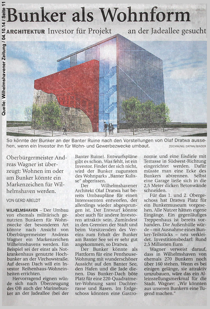 Verein zum Erhalt der Bunker am Banter See in Wilhelmshaven e.V.: Heute in der WZ: Investor aus Oldenburg plant Häuser am Banter See. Beide Bunker müssen abgerissen werden. Wir kämpfen weiter für den Erhalt!