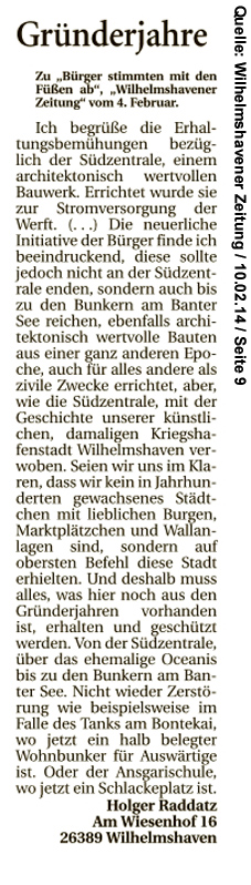 28. Februar 2014: Dramatische Entwicklung in Sachen Südzentrale. Vor einigen Tagen erschien die Pressemeldung, das Bauwerk solle bereits innerhalb der nächsten zwei Wochen abgerissen werden. Heute wiederum wurde über Radio Jade mitgeteilt, es gebe noch einen Aufschub von zwei Monaten. Der Abriss sei aber bereits in Auftrag gegeben. Nur ein millionenteurer Kauf durch die Stadt könne das Schicksal der Südzentrale noch abwenden...