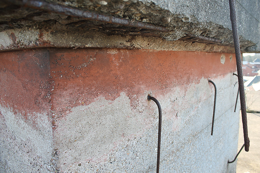 Hochbunker Sedan: Heute hatten wir die Gelegenheit, nach Jahren wieder das Dach des Bunkers zu besteigen, nun auch endlich den Lüftungsturm. Diesmal war der Weg auf das Dach recht einfach, denn am 19.03.14 wurde an der Westwand des Bunkers ein Gerüst angesetzt. Hier werden vom 28. bis 30.03.14 die ersten Werbebanner installiert im Zuge des Bunkerprojektes. Wir sind vor Ort und werden berichten. Manchmal sieht man den Wald vor lauter Bäumen nicht: Heute fiel es uns wie Schuppen von den Augen. Der Unterbereich direkt unter der Überkragung des Lüftungsturms ist ziegelrot gestrichen. Warum?