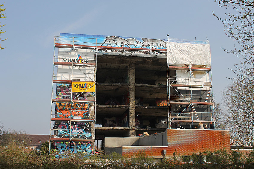 Wieder Abriss: In diesen Tagen wird das gesamte Gebäude mit der anliegenden Halle 7 auf dem Gelände der Firma Manitowoc abgerissen, um einem Neubau Platz zu machen. Wieder ist damit in Kürze ein historischer Teil Wilhelmshavens und nicht zuletzt der ehemaligen Westwerft verschwunden. Auch die dortigen LS-Kellerreste sind damit bald Vergangenheit. Hier