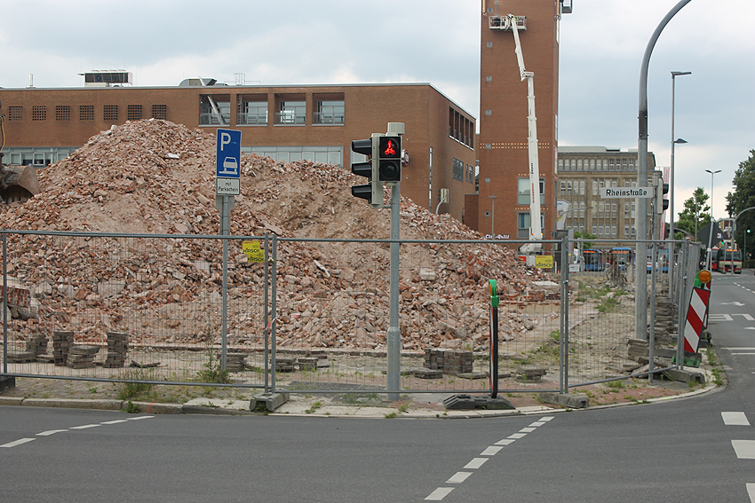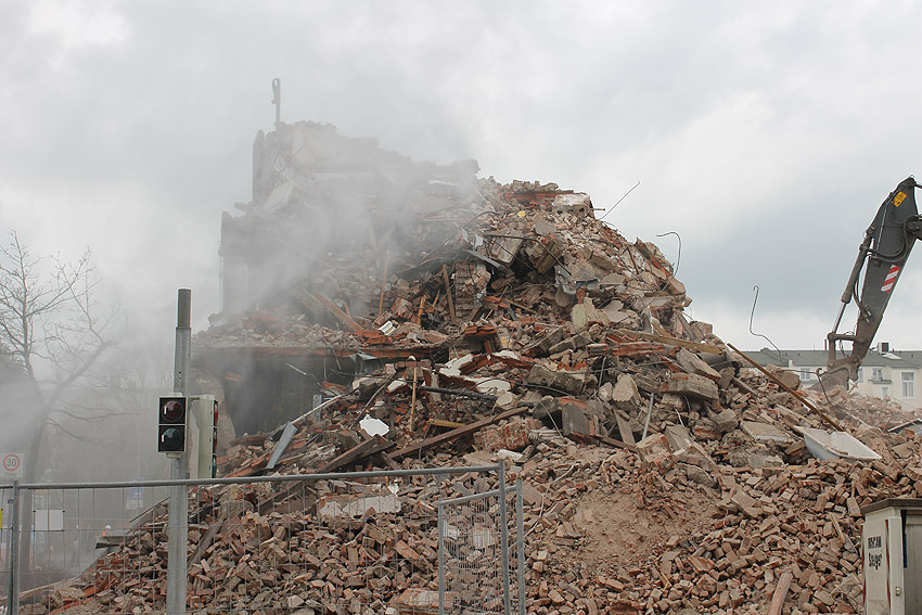 Vorgestern erfolgte die letzte Phase des Abrisses vom alten Möller-Gebäude, welches sich nachmittags beim Abbruch des Türrestes Rheinstraße 75 (und einmal bereits kurz vorher) mit einem kleinen Regenbogen - wohl hervorgerufen durch die abrissbegleitende Wasser(Schnee)-Maschine - in die Geschichte verabschiedete. Nicht ganz wahr ist jedoch, dass neben dem Gebäude ein gewaltiger Truppenmannschaftsluftschutzturm TM-LST 2250 stand. Es kann aber nicht ganz ausgeschlossen werden, dass es für das Bauunternehmen im Hof einen externen Schutzraum zusätzlich zum Luftschutzkeller im Gebäude gab. Unser Leser Walter, der sich gestern fasziniert bei uns meldete, wusste zudem von einem unterirdischen Gang vom alten Hauptbahnhof zum Möller-Gebäude und weiter bis zum OP-Bunker Virchowstraße zu erzählen. Weiterhin stellte er die These auf, der "TM-LST 2250" sei nach dem Krieg in die fünfte Dimension (!) verschwunden und in den 1990ern als Nordseepassage schließlich leicht errötet wieder aufgetaucht. Da kriegt man ja graue Haare! ;-) Ob eine Wilhelmyna die Dritte das Motto „LET it OUT“ bekannt machte, ist leider nicht belegt. Ebenfalls ist unklar, ob und wann sie überhaupt existierte. Durchaus belegt war in den vergangenen Tagen allerdings der Bereich Virchowstraße / Rheinstraße mit einer feinen Staubschicht. Die Leser mögen uns den diesjährigen kleinen Aprilscherz nicht übel nehmen.