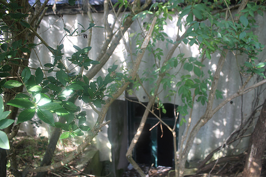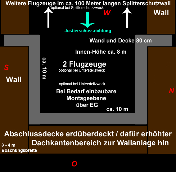 Wittmundhafen / Jackstede: Jetzt besucht - Wohl bombensichere Wartung und Unterbringung von bis zu 2 Flugzeugen in einem ausladend dimensionierten Bunker nördlich von Wittmundhafen. Explizit besaß das Objekt den Zweck einer Bordwaffen-Justieranlage. Man kann sich dies wie einen überdimensionalen Schießstand vorstellen, daher auch die enorme Massivbauweise. Ein Ausweichplatz für Flugzeuge in der für den Justierstand ausgehobenen Schneise zwischen einem langen Splitterschutzdoppelwall westlich angrenzend an den Bunker (im Falle einer Bombardierung des Einsatzhafens Wittmundhafen) wurde angelegt. Dieser Graben zwischen den Wällen diente jedoch hauptsächlich für die Bordwaffentests. Noch heute ist der Halbkreis der ehemaligen betonierten Hauptzuwegung vom Fliegerhorst zum hier anliegenden Munitionslager aus der Luft zu sehen... Ein zweiter Bunker für Justierzwecke befand sich südlich des Einsatzhafens. Davon scheint jedoch nichts mehr vorhanden zu sein. Weder Wälle noch Reste des Bunkerkörpers. Nach dem Krieg schnell demilitarisiert liegen die diversen Betontrümmer der unbewehrten Anlage noch heute eindrucksvoll mitten im Wald. Das Gelände ist in Privateigentum und darf nur mit Genehmigung betreten werden. Hier
