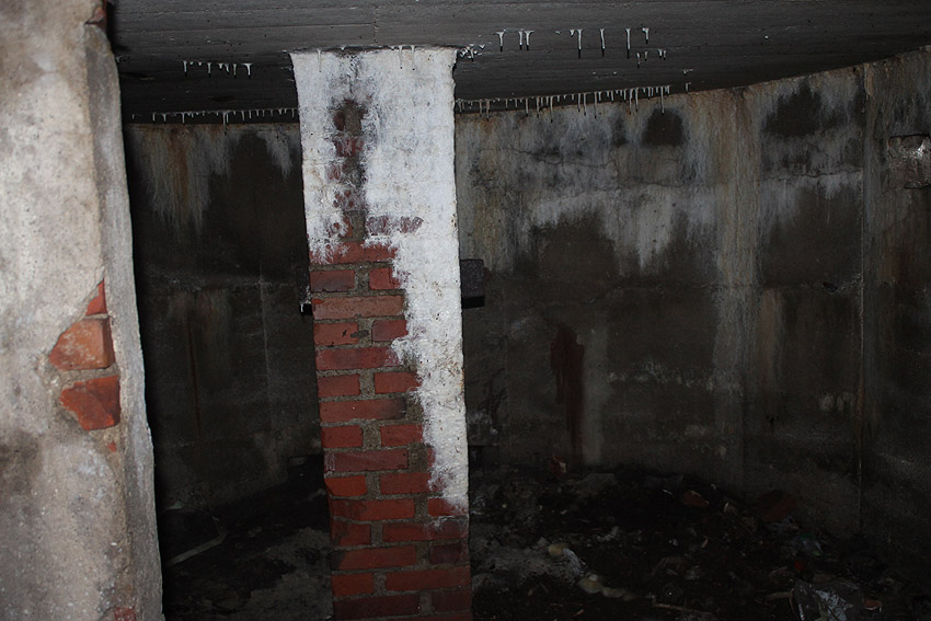 Runder Kleinbunker Lager Fedderwardergroden: Es ist zu erkennen, dass die Splitterschutzprellwand vor dem Bunkereingang und auch die Wandbereiche des Bunkers selbst aus Betonformsteinen errichtet wurden. Am Bunker wurden die Steine nach außen hin zudem mit einer Betonschicht verputzt und geglättet, so dass die Wand wie ein massiver, gegossener Körper erschien. Die Steine bestehen aus einem Betonkern in fast quaderförmiger Bauform, jedoch mit leicht konischer Verjüngung der Seitenflanken nach innen. Um den Kern herum wurde eine Betonhülle gegossen, um die gewünschte runde Form in exakt der Winkelkrümmung zu erzielen, die für den Bunker und die Prellwand erforderlich war. Auch die anderen Exemplare dieses Bunkertyps in Fedderwardergroden könnten im Wandbereich aus diesen Betonformsteinen errichtet worden sein. Das gilt als sehr wahrscheinlich. Eine seinerzeitige Sprengung des Bunkers hier am Graben ist aufgrund der Formsteinwände und damit relativ leichten Bauform mittlerweile fast auszuschließen. Hier