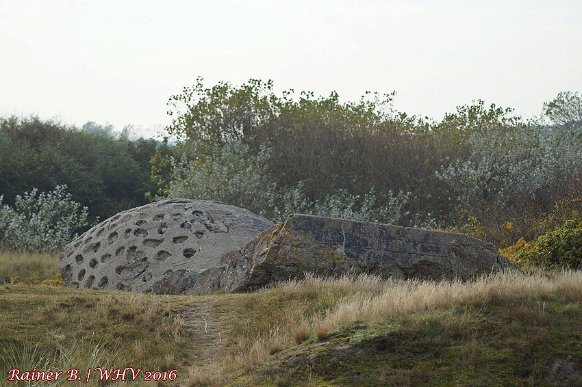Wangerooge: Im Bereich der ehemaligen Marine-Flakstellung Ostdüne wurden nun die beiden Nord-Geschützbunker / Bettungen fotografiert. Diese befinden sich direkt am Strand / Dünenkamm und wurden im Jahre 2007 bei einer Sturmflut freigespült. Unweit südwestlich der damaligen Flakstellung Jade-Ost befindet sich ein massiver Bunkerrest, eventuell ein gesprengter Regelbau. Vielen Dank an Rainer B. für die Bereitstellung des Fotomaterials! Hier und Hier