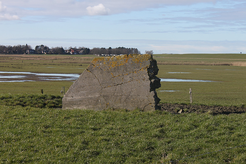 Vermuteter Scheinwerferstandrest (Stand 12) bei Dangast: Ein Stück weiter östlich der ehemaligen schweren Flakstellung Dangast befindet sich dieses massive Betontrümmerstück auf einer Weide am Deich. Der Scheinwerferstand 12 befand sich zunächst direkt an der Flakbatterie auf dem Deich in Dangast. Im Buch "Die Luftverteidigung im Abschnitt Wilhelmshaven 1939-1945 (2. Marineflakbrigade)" von Friedrich August Greve ist jedoch in der Skizze im Buchdeckel der Scheinwerferstand 12 genau hier eingezeichnet, wo sich das Betonrelikt befindet. Es dürfte wohl wahrscheinlich sein, dass der Stand in späteren Kriegsjahren hierhin auf einen verbunkerten Sockel versetzt wurde. Das Objekt wurde nach dem Krieg gesprengt und größtenteils abgetragen. Auch befindet sich das ehemalige Infanteriewerk Wehgast unweit südwestlich des Objektes. Besteht hier ein Zusammenhang? Im kleinen Dreieckswäldchen westlich des Trümmerstückes sind zudem Fundamentreste zu sehen... Danke an Jan Ellerbrock für das Fotomaterial! Hier