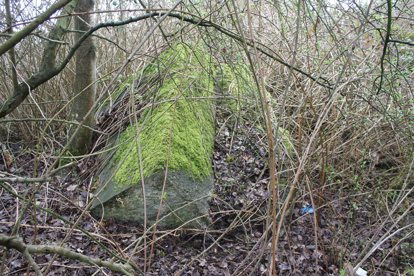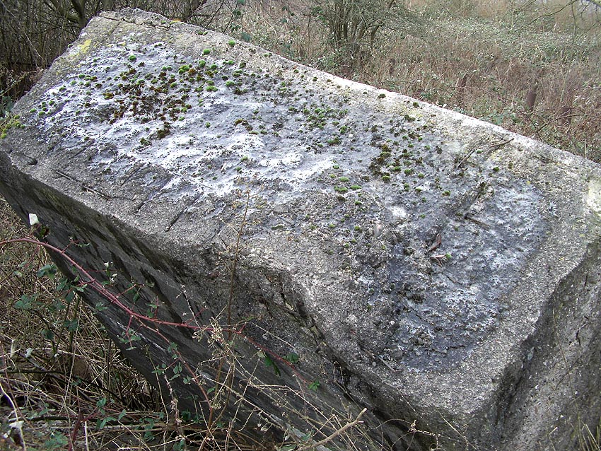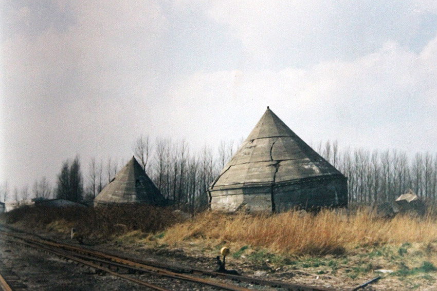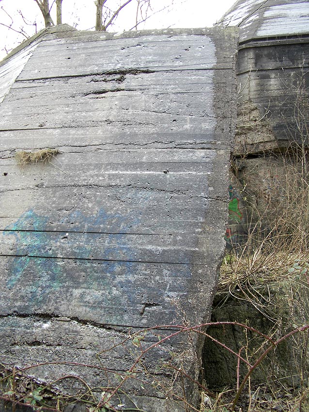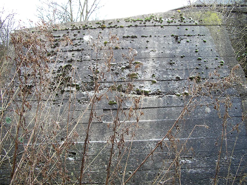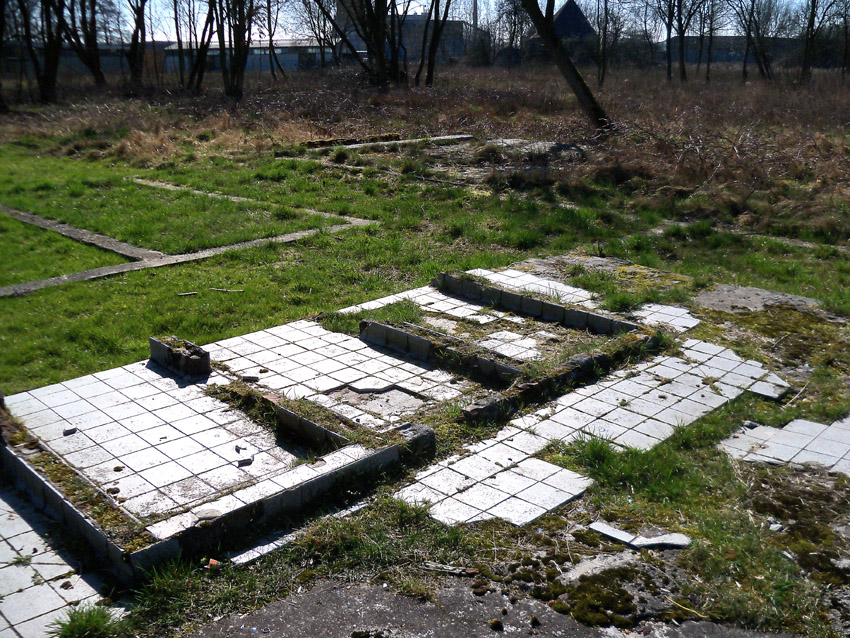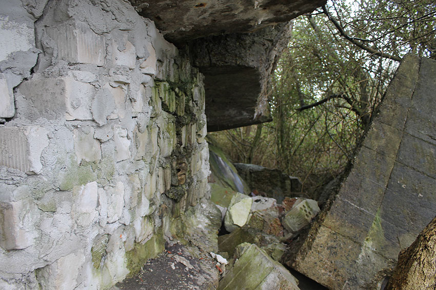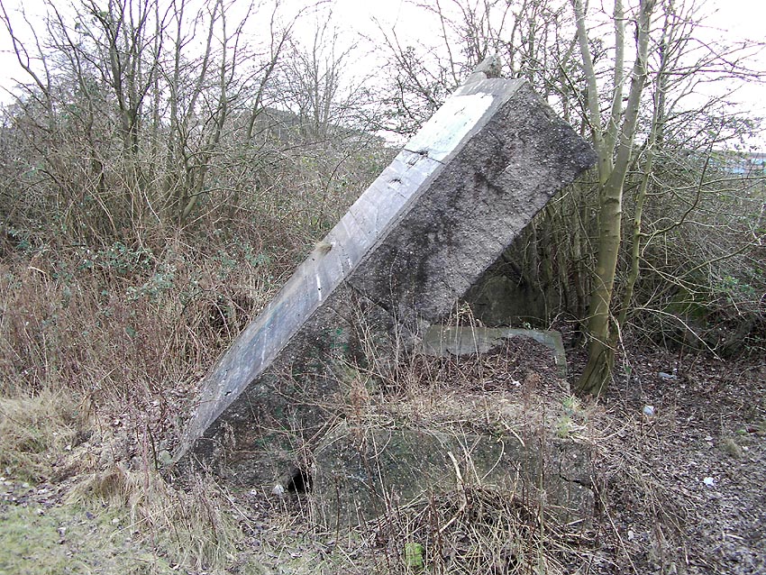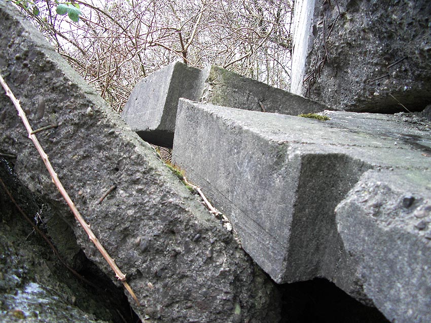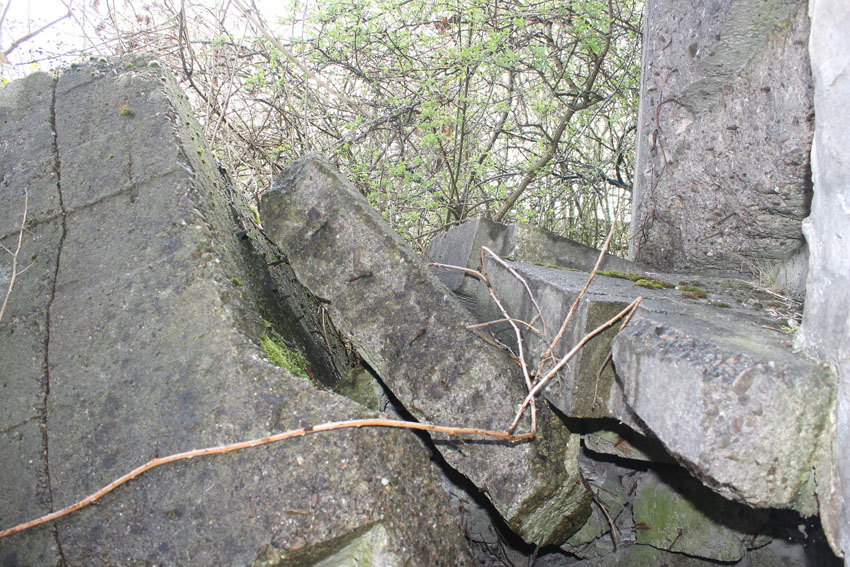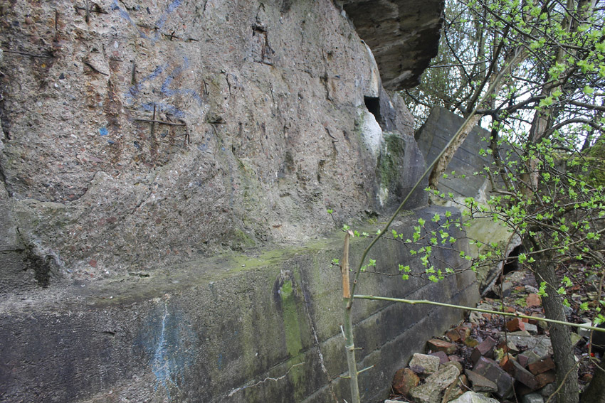 Unter dem zweiten Pfeil von links die Kuppel des gesprengten Turmes. Die Reste der (Rund)Türme 3 und 4 waren hier bereits scheinbar großteilig entfernt (größerer Bildausschnitt nach links hin liegt vor). Dies dürfte damit zusammenhängen, dass diese spärlicher bewehrt waren und die Trümmer somit leichter beseitigt werden konnten. Auch die Sprengung selbst dürfte diese Türme in kleinere Trümmer zerborsten haben, als die anderen Exemplare im Banter Lager.