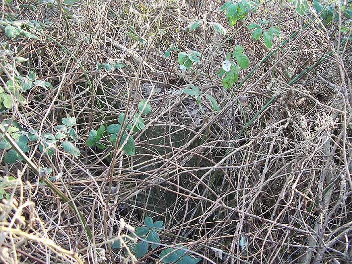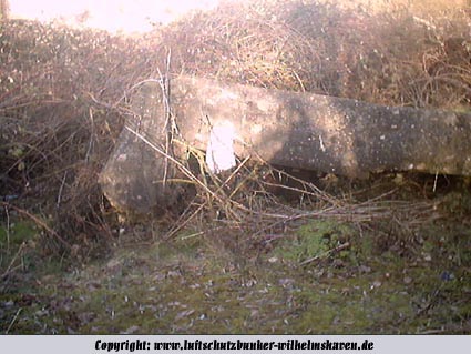 Das einzige große erhaltene Trümmerstück auf der Fundamentplatte / Zerschellerplatte muss aus dem Inneren des Turmes stammen, vielleicht Teil einer Decke / Trennwand? Es könnte auch sein, dass dies die innere Prellwand der Gasschleuse eines der Eingangsbereiche war. Die Wand wäre dann aus dieser Blickrichtung nach vorne auf den Boden gekippt. Das Trümmerstück entspricht in seiner Tiefe einer Geschosshöhe...