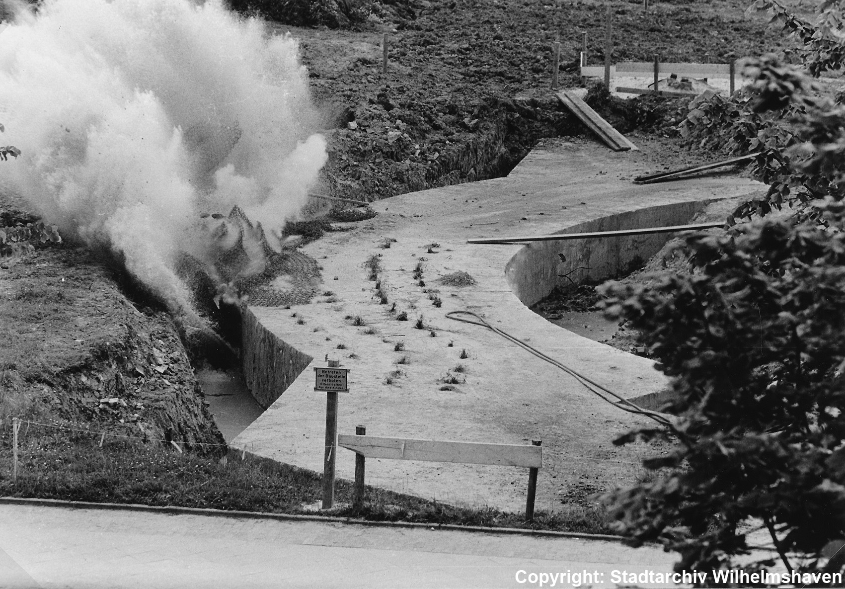 Gut zu sehen ein Teil der gewaltigen, unter Umständen bereits vollendeten Zerschellerplatte während der Sprengung / Blick vom Banter Weg nach Osten / unten rechts im Bild im Bereich der scharfen Eckung der Platte wäre der westliche Splitterschutzvorbau eingesetzt worden...