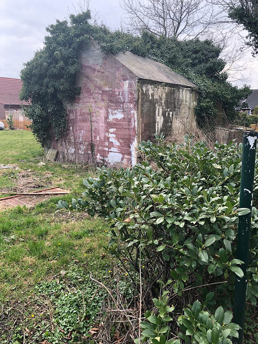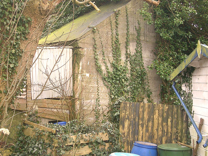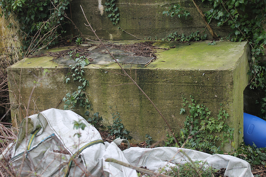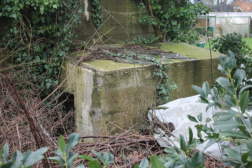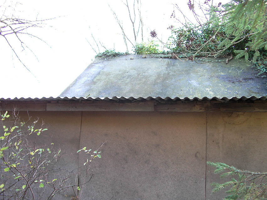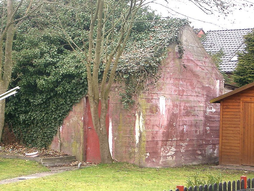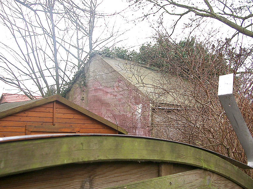 Der Kleinbunker besaß ein Spitzdach mit leicht abgeschrägtem Dachkantenbereich. Hier ergeben sich erstaunliche Ähnlichkeiten zum betonierten Deckungsgraben hinter der Klinkerstraße: