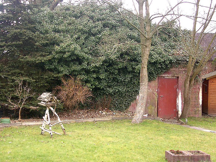 Handelt es sich um das letzte Element eines ursprünglich "mehrteiligen" Deckungsgrabens wie z.B. Potenburger Weg? Fügte / fügten sich am Westende ursprünglich noch weitere Elemente an? Oder waren zumindest weitere Elemente geplant (nicht ausgeführt aufgrund "wichtigerer" Bunkerbaustellen...) und der Durchgang wurde dann nachträglich versiegelt (daraufhin Schaffung des splittergeschützten Notausstieges an der Nordseite bei der Westecke? Unwahrscheinlich. Denkbar wäre es aber dennoch.