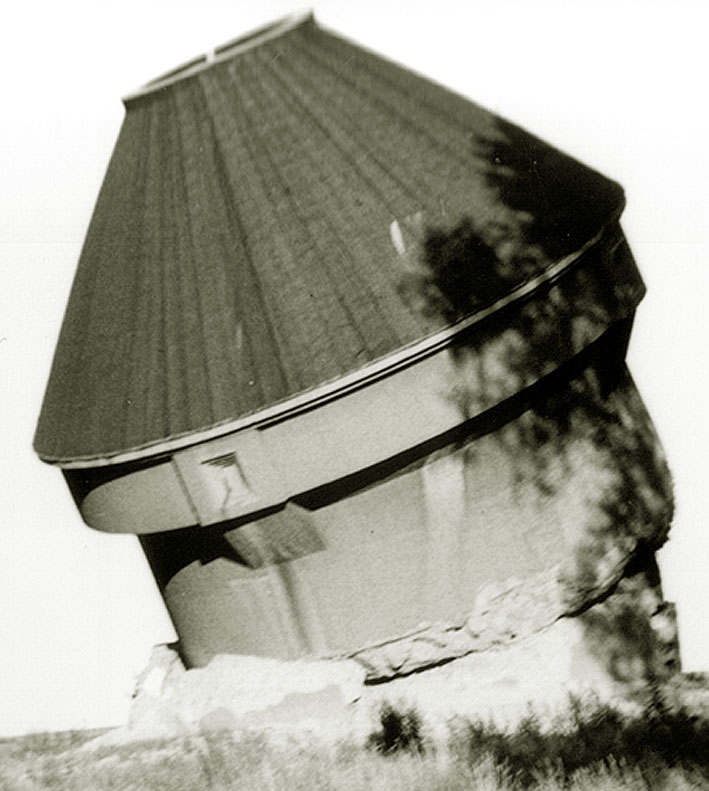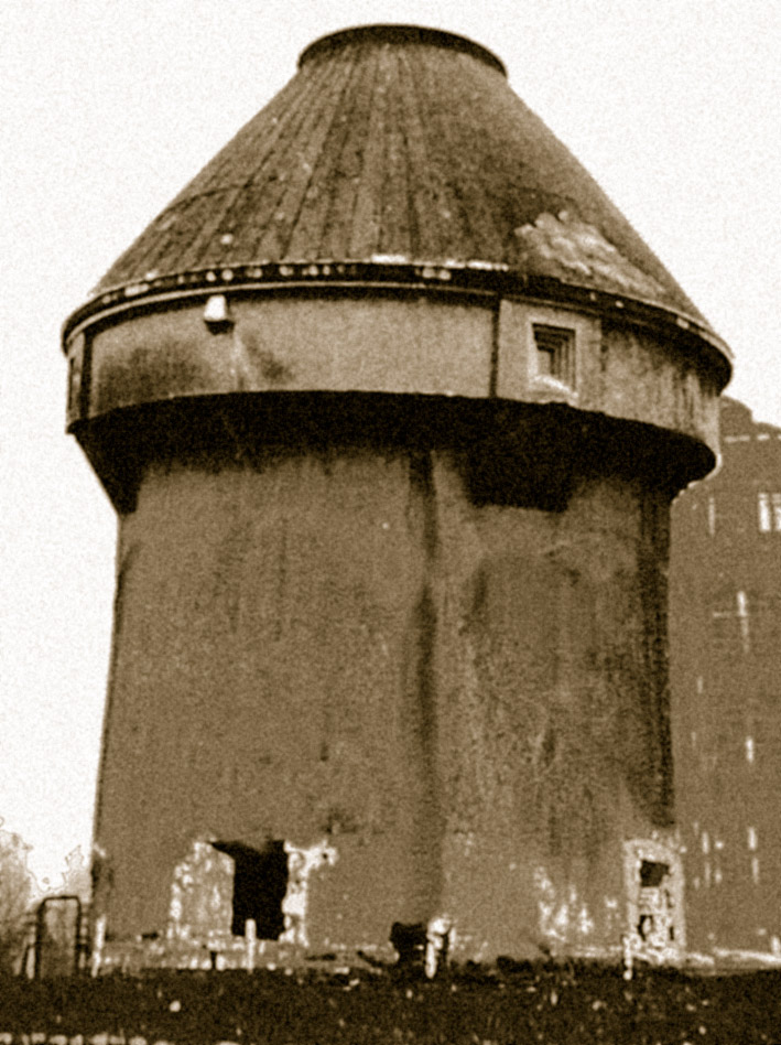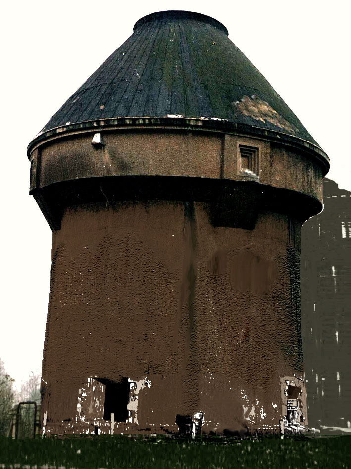 So oder ähnlich könnte der Dietel-Turm im intakten Zustand von nahem ausgesehen haben. Er hatte vier Eingänge, welche ursprünglich mit einem Sandsteinkranz verziert worden waren. Der Turm war äußerlich mit Spritzputz versehen worden. Ob auf der Dachplattform ein Flakgeschütz, ein Scheinwerferstand oder auch nur ein Beobachterposten war, ist bislang unbekannt. Dieser Dietel-Turm war die "zivile" Variante seines Types, die militärischen Sichtscharten / Schießscharten zur Nahverteidigung fehlten. Teilweise waren sie nur angedeutet und verblendet.