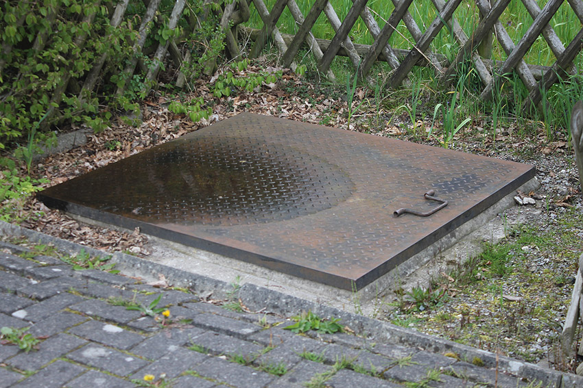 Oben: Stahlklappe im Boden direkt östlich des Maschinenbunkers