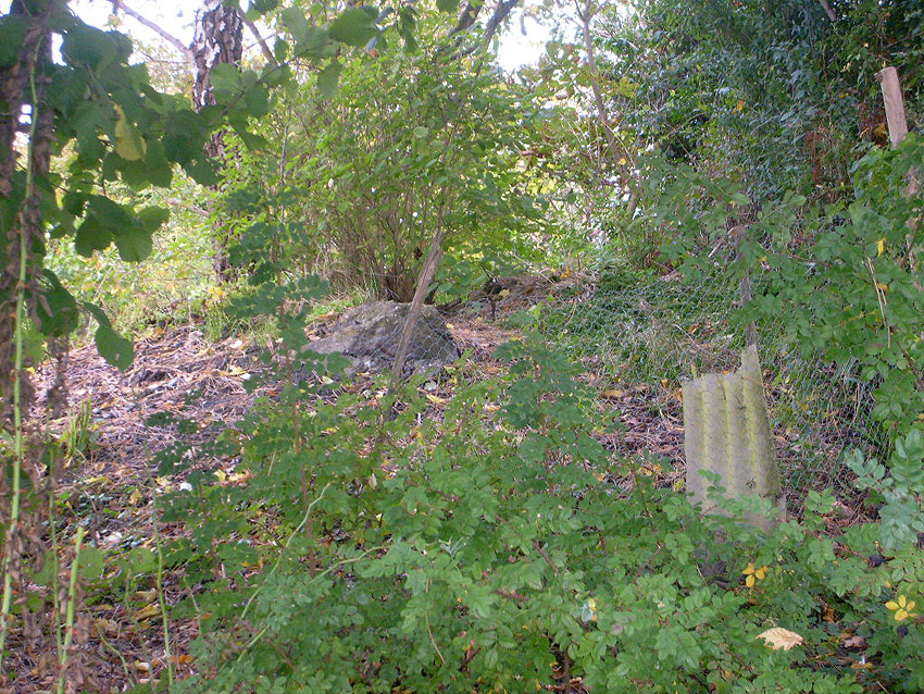 Oben: Wenige Reste des Munitionsbunkers in einem heutigen Garten. Die ersichtlichen Betonstücke wurden zu einer dekorativen Säule zusammengesetzt.