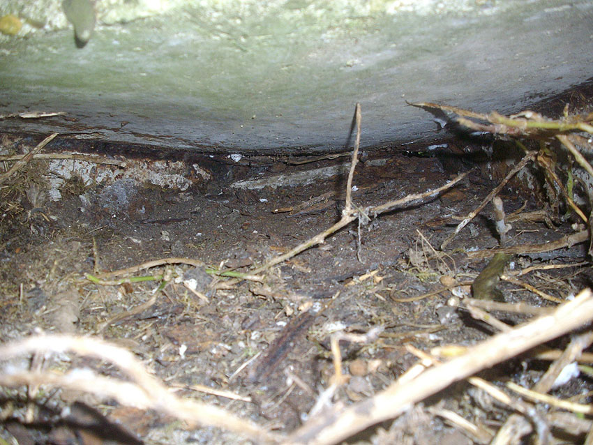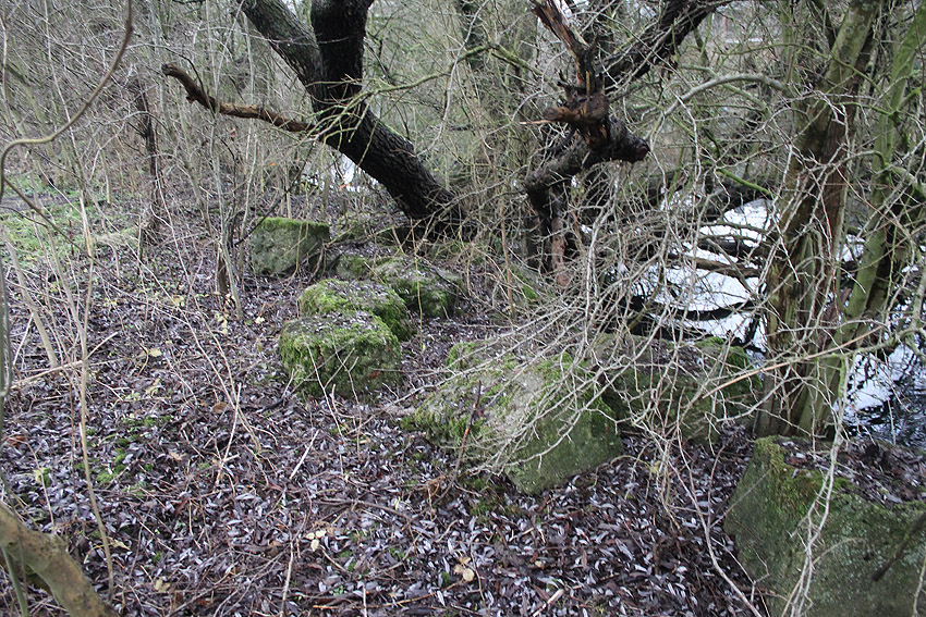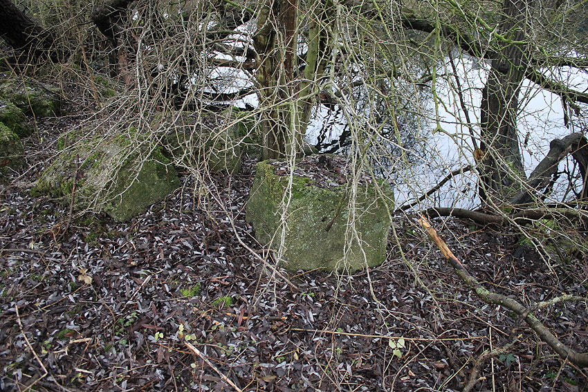 Nachtrag 09.01.18: Das Innere zeigt einen Schacht mit einer Art Schieber am Boden. Vom Fortgraben her ist ein Zufluß vorhanden, dieser ist mit Gestein, usw. verstopft. Wahrscheinlich nachträglich verstopft, um eine Verringerung des Wasserstandes des alten Fortgrabens bei Niedrigwasser der Maade / bei Schieberöffnung zu verhindern. Zur nahen Maade hin befindet sich ein Kanalrohr, im Bild am Pfeil ansatzweise zu erkennen. Hier sollte wohl der Wasserstand vom Fortgraben im Zusammenspiel mit der Maade reguliert werden. Was die Betonquader im Umfeld für einen Zweck hatten, ist allerdings weiterhin ungeklärt.
