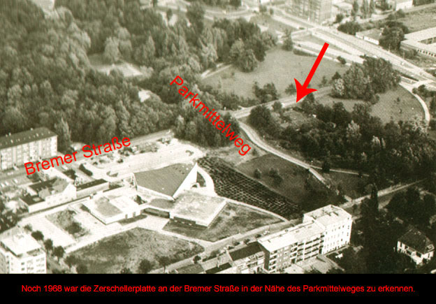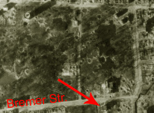 Die Aufnahme wurde wahrscheinlich vom Parkmittelweg aus gemacht. Der Radfahrer fährt die Bremer Straße Richtung Osten entlang.