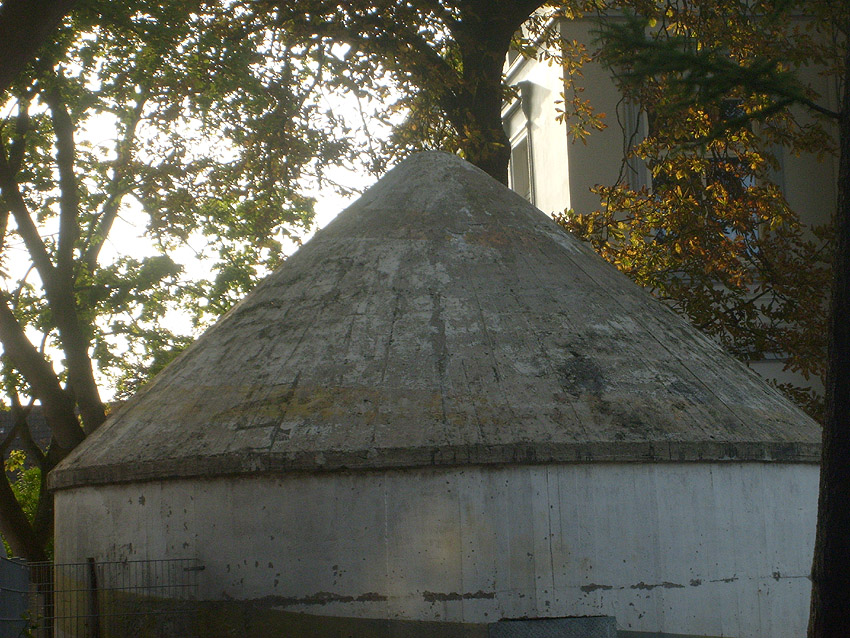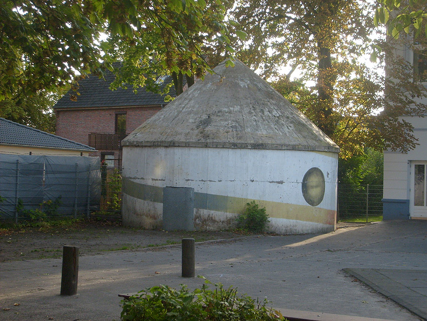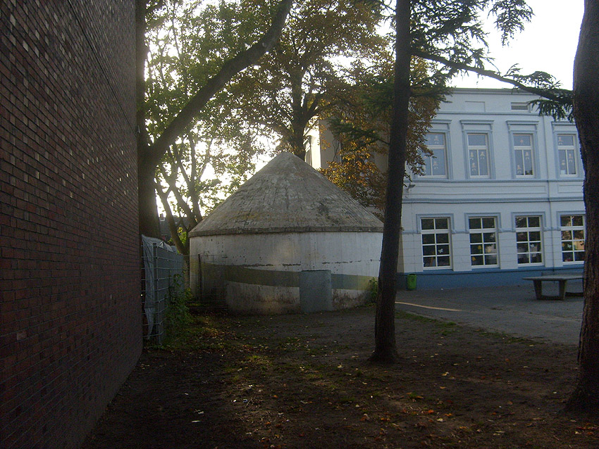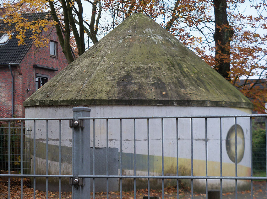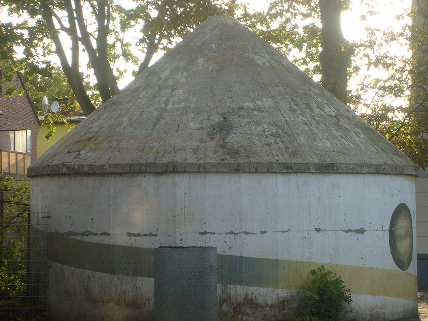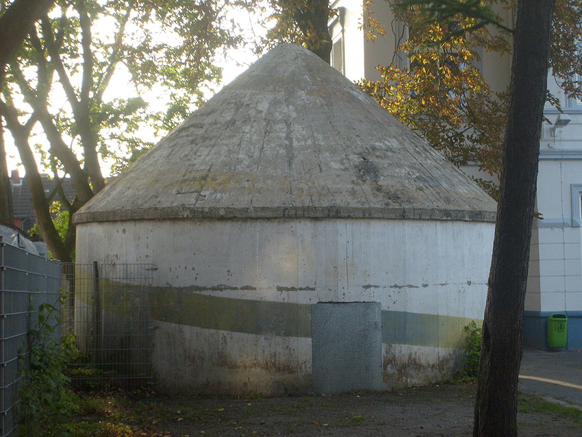 Wie auch beim baugleichen Rundbunker auf dem Schulhof der Franziskusschule ist zu sehen, dass der Haupteingang stets vom Gebäude weg zeigte. Im Falle einer Zertrümmerung des Gebäudes durch Bombentreffer sollte der Zugang keinesfalls verschüttet werden.